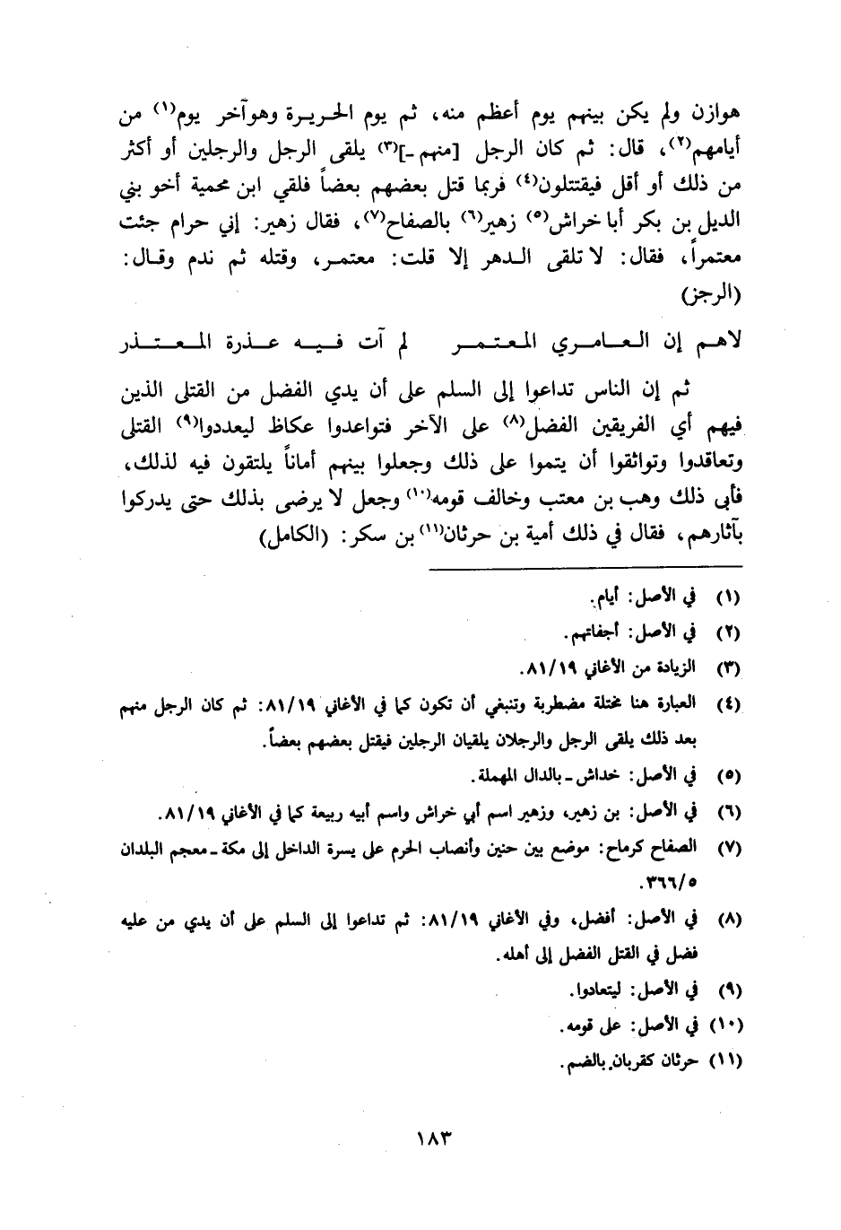 [4] العبارة هنا مختلة مضطربة وتنبغي أن تكون كما في الأغاني 19/ 81: ثم كان الرجل منهم بعد ذلك يلقى الرجل والرجلان يلقيان الرجلين فيقتل بعضهم بعضا.