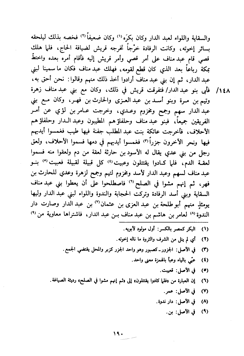 والسقاية واللواء لعبد الدار وكان بكره [1] وكان ضعيفا [2] فخصه بذلك ليلحقه بسائر إخوته، وكانت الرفادة خرجا تخرجه قريش لضيافة الحاج، فلما هلك قصي قام عبد مناف على أمر قصي وأمر قريش إليه فأقام أمره بعده واختطّ بمكة رباعا بعد الذي كان قطع لقومه، فهلك عبد مناف فكان ما سمينا لبني عبد الدار، ثم إن بني عبد مناف أرادوا أخذ ذلك منهم وقالوا: نحن أحق به، فأبى بنو عبد الدار فتفرقت قريش في ذلك، وكان مع بني عبد مناف زهرة وتيم بن مرة وبنو أسد بن عبد العزى والحارث بن فهر، وكان مع بني عبد الدار سهم وجمح ومخزوم وعدي، وخرجت عامر بن لؤي عن أمر الفريقين جميعا، فبنو عبد مناف وحلفاؤهم المطيبون وعبد الدار وحلفاؤهم الأحلاف، فأخرجت عاتكة بنت عبد المطلب جفنة فيها طيب فغمسوا أيديهم فيها ونحر الآخرون جزرا [3] فغمسوا أيديهم في دمها فسموا الأحلاف، ولعق رجل من بني عدي يقال له الأسود بن حارثة لعقة من دم ولعقوا منه فسموا لعقة الدم، فلما كادوا يقتتلون وعبيت [4] كل قبيلة لقبيلة فعبيت [5] بنو عبد مناف لسهم وعبد الدار لأسد ومخزوم لتيم وجمح لزهرة وعدي للحارث بن فهر، ثم إنهم مشوا في الصلح [6] فاصطلحوا على أن يعطوا بني عبد مناف السقاية وبني أسد الرفادة وتركت الحجابة والندوة واللواء لبني عبد الدار وليها يومئذ منهم أبو طلحة بن عبد العزى بن عثمان [7] بن عبد الدار وصارت دار الندوة [8] لعامر بن هاشم بن عبد مناف بن عبد الدار، فاشتراها معاوية من [9]