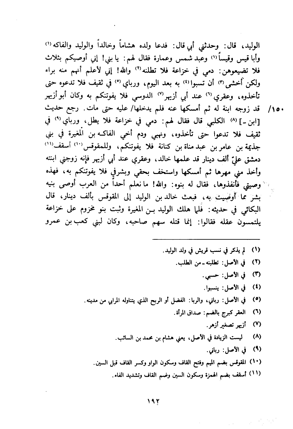الوليد، قال: وحدثني أبي قال: فدعا ولده هشاما وخالدا والوليد والفاكه [1] وأبا قيس وقيسا [1] وعبد شمس وعمارة فقال لهم: يا بني! إني أوصيكم بثلاث فلا تضيعوهن: دمي في خزاعة فلا تطلنه [2] والله! إني لأعلم أنهم منه براء ولكن أخشى [3] أن تسبوا [4] به بعد اليوم، ورباي [5] في ثقيف فلا تدعوه حتى تأخذوه، وعقري [6] عند أبي أزيهر [7] الدوسي فلا يفوتنكم به وكان أبو أزيهر قد زوجه ابنة له ثم أمسكها عنه فلم يدخلها عليه حتى مات. رجع حديث [ابن-] [8] الكلبي قال فقال لهم: دمي في خزاعة فلا يطل، ورباي [9] في ثقيف فلا تدعوا حتى تأخذوه، ونهبي ودم أخي الفاكه بن المغيرة في بني جذيمة بن عامر بن عبد مناة بن كنانة فلا يفوتنكم، وللمقوقس [10] أسقف [11] دمشق عليّ ألف دينار قد علمها خالد، وعقري عند أبي أزيهر فإنه زوجني ابنته وأخذ مني مهرها ثم أمسكها واستخف بحقي وبشر في فلا يفوتنكم به، فهذه وصيتي فأنفذوها، فقال له بنوه: والله! ما نعلم أحدا من العرب أوصى بنيه بشر مما أوصيت به، فبعث خالد بن الوليد إلى المقوقس بألف دينار، قال البكائي في حديثه: فلما هلك الوليد بن المغيرة وثبت بنو مخزوم على خزاعة يلتمسون عقله فقالوا: إنما قتله سهم صاحبه، وكان لبني كعب بن عمرو