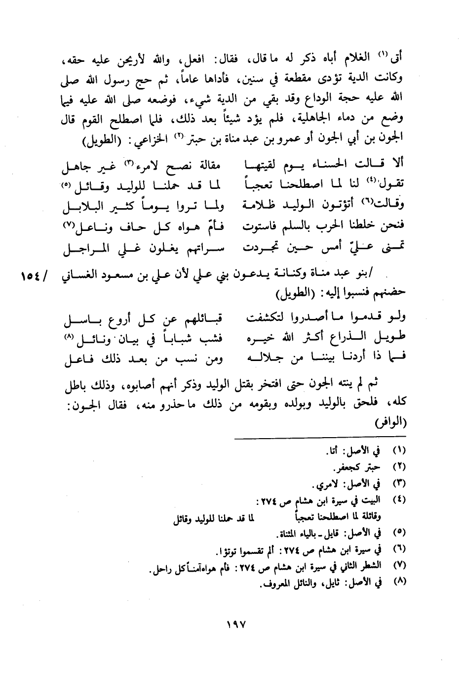 أتى [1] الغلام أباه ذكر له ما قال، فقال: افعل، والله لأريحن عليه حقه، وكانت الدية تؤدى مقطعة في سنين، فأداها عاما، ثم حج رسول الله صلى الله عليه حجة الوداع وقد بقي من الدية شيء، فوضعه صلى الله عليه فيما وضع من دماء الجاهلية، فلم يؤد شيئا بعد ذلك، فلما اصطلح القوم قال الجون بن أبي الجون أو عمرو بن عبد مناة بن حبتر [2] الخزاعي: (الطويل)