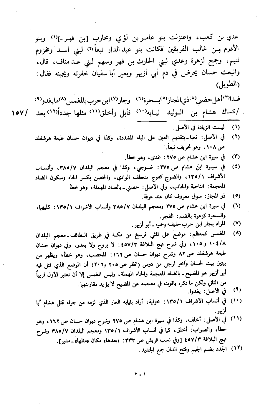 [8] المغمس كمعظم: موضع على ثلثي فرسخ من مكة في طريق الطائف- معجم البلدان 8/ 104 و 105، وفي شرح نهج البلاغة 3/ 457: لا يروح ولا يعدو، وفي ديوان حسان طبعة هرشفلد ص 82 وشرح ديوان حسان ص 162: المحصب، وهو خطأ، ويظهر من بيتين بيت لحسان وآخر لرجل من دوس (انظر ص 205 و 206) أن الموضع الذي قتل فيه أبو أزيهر هو المضيح- بالضاد المعجمة والحاء المهملة، وليس المغمس إلا أن نعتبر الأول قريبا من الثاني ولكن ما ذكره ياقوت في معجمه عن المضيح لا يؤيد مقاربتهما.