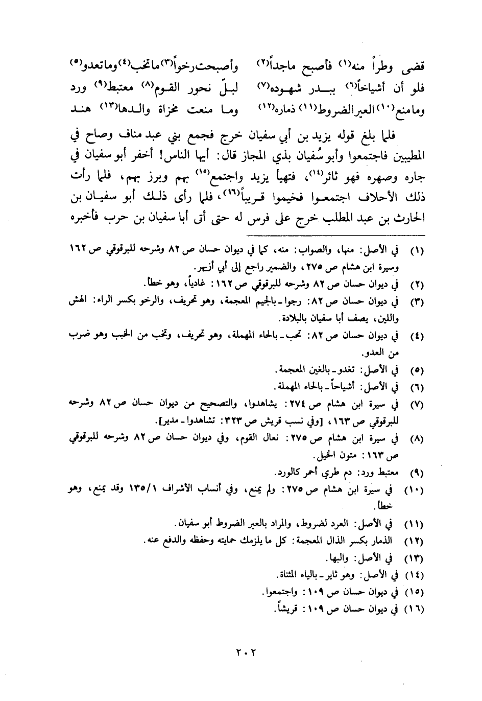 [7] في سيرة ابن هشام ص 274: يشاهدوا، والتصحيح من ديوان حسان ص 82 وشرحه للبرقوقي ص 163، [وفي نسب قريش ص 323: تشاهدوا- مدير] .