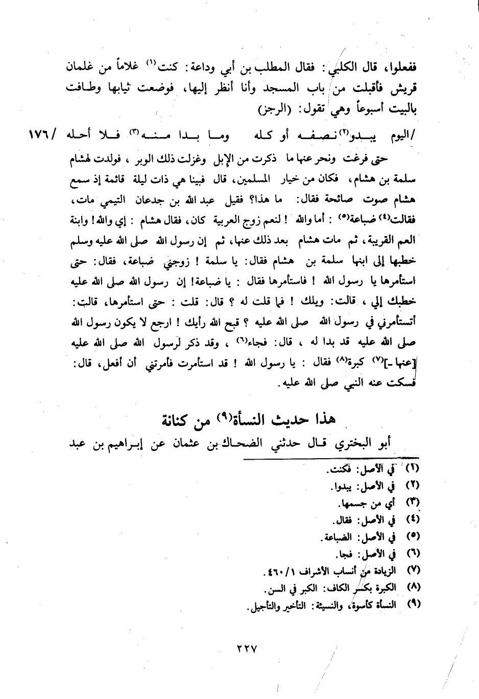 حتى فرغت ونحر عنها ما ذكرت من الإبل وغزلت ذلك الوبر، فولدت لهشام سلمة بن هشام، فكان من خيار المسلمين، قال فبينا هي ذات ليلة قائمة إذ سمع هشام صوت صائحة فقال: ما هذا؟ فقيل عبد الله بن جدعان التيمي مات، فقالت [4] ضباعة [5] : أما والله! لنعم زوج العربية كان، فقال هشام: إي والله! وابنة العم القريبة، ثم مات هشام بعد ذلك عنها، ثم إن رسول الله صلى الله عليه وسلم خطبها إلى ابنها سلمة بن هشام فقال: يا سلمة! زوجني ضباعة، فقال: حتى استأمرها يا رسول الله! فاستأمرها فقال: يا ضباعة! إن رسول الله صلى الله عليه خطبك إلي، قالت: ويلك! فما قلت له؟ قال: قلت: حتى استأمرها، قالت: