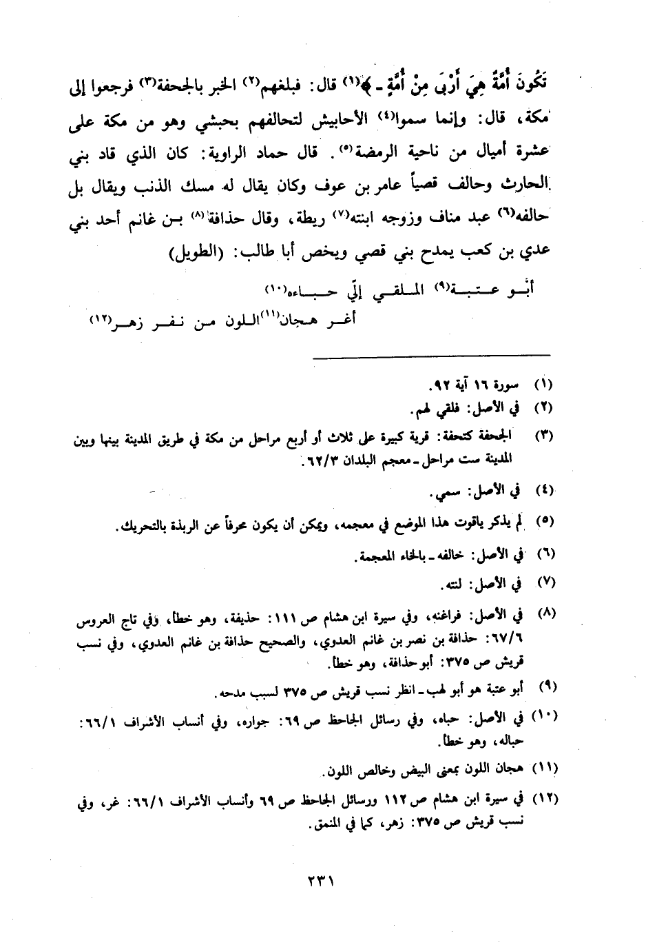 تَكُونَ أُمَّةٌ هِيَ أَرْبى من أُمَّةٍ- 16: 92 [1] قال: فبلغهم [2] الخبر بالجحفة [3] فرجعوا إلى مكة، قال: وإنما سموا [4] الأحابيش لتحالفهم بحبشي وهو من مكة على عشرة أميال من ناحية الرمضة [5] . قال حماد الرواية: كان الذي قاد بني الحارث وحالف قصيا عامر بن عوف وكان يقال له مسك الذنب ويقال بل حالفه [6] عبد مناف وزوجه ابنته [7] ريطة، وقال حذافة [8] بن غانم أحد بني عدي بن كعب يمدح بني قصي ويخص أبا طالب: (الطويل)