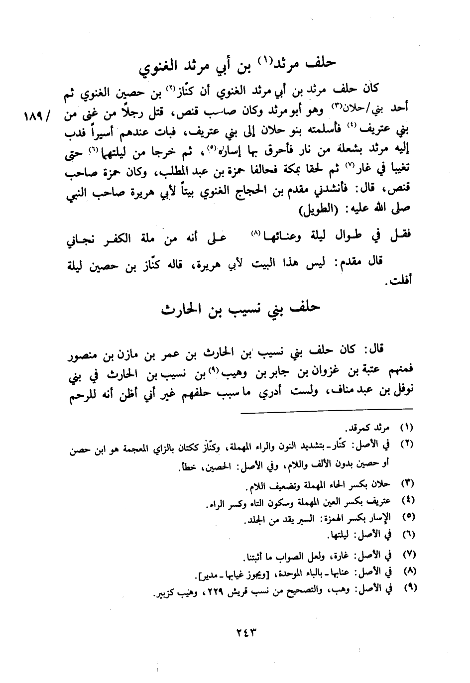 كان حلف مرثد بن أبي مرثد الغنوي أن كنّاز [2] بن حصين الغنوي ثم أحد بني حلان [3] وهو أبو مرثد وكان صاحب قنص، قتل رجلا من غنى من بني عتريف [4] فأسلمته بنو حلان إلى بني عتريف، فبات عندهم أسيرا فدب إليه مرثد بشعلة من نار فأحرق بها إساره [5] ، ثم خرجا من ليلتهما [6] حتى تغيبا في غار [7] ثم لحقا بمكة فحالفا حمزة بن عبد المطلب، وكان حمزة صاحب قنص، قال: فأنشدني مقدم بن الحجاج الغنوي بيتا لأبي هريرة صاحب النبي صلى الله عليه: (الطويل)