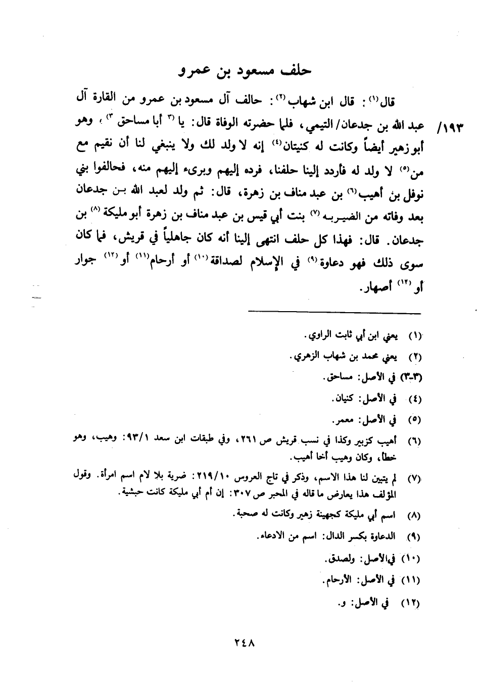 قال [1] : قال ابن شهاب [2] : حالف آل مسعود بن عمرو من القارة آل عبد الله بن جدعان/ التيمي، فلما حضرته الوفاة قال: يا [3] أبا مساحق [3] ، وهو أبو زهير أيضا وكانت له كنيتان [4] إنه لا ولد لك ولا ينبغي لنا أن نقيم مع من [5] لا ولد له فأردد إلينا حلفنا، فرده إليهم وبرئ إليهم منه، فحالفوا بني نوفل بن أهيب [6] بن عبد مناف بن زهرة، قال: ثم ولد لعبد الله بن جدعان بعد وفاته من الضيربه [7] بنت أبي قيس بن عبد مناف بن زهرة أبو مليكة [8] بن جدعان. قال: فهذا كل حلف انتهى إلينا أنه كان جاهليا في قريش، فما كان سوى ذلك فهو دعاوة [9] في الإسلام لصداقة [10] أو أرحام [11] أو [12] جوار أو [12] أصهار.