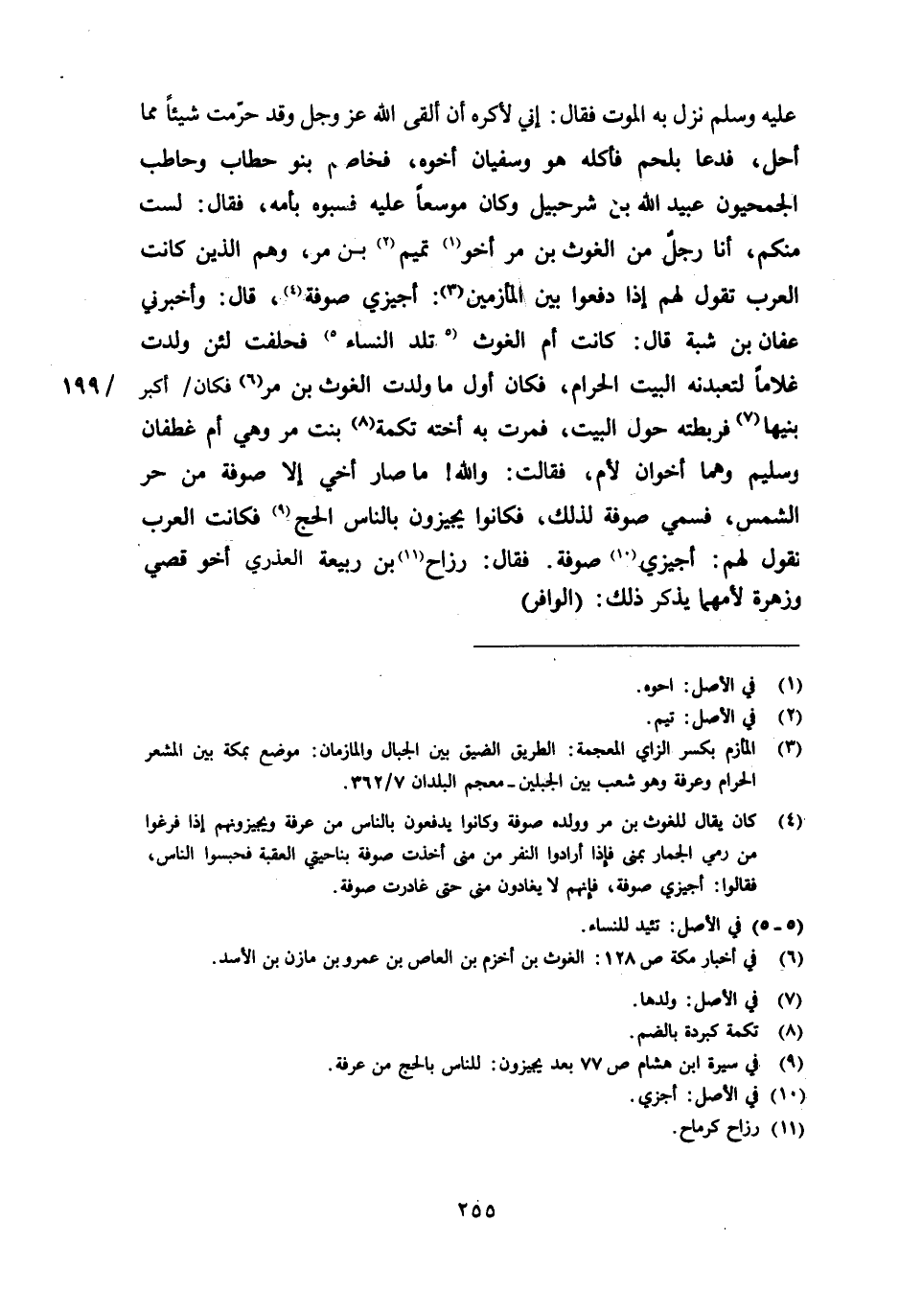 عليه وسلم نزل به الموت فقال: إني لأكره أن ألقى الله عز وجل وقد حرّمت شيئا مما أحل، فدعا بلحم فأكله هو وسفيان أخوه، فخاصم بنو حطاب وحاطب الجمحيون عبيد الله بن شرحبيل وكان موسعا عليه فسبوه بأمه، فقال: لست منكم، أنا رجل من الغوث بن مر أخو [1] تميم [2] بن مر، وهم الذين كانت العرب تقول لهم إذا دفعوا بين المأزمين [3] : أجيزي صوفة [4] ، قال: وأخبرني عفان بن شبة قال: كانت أم الغوث [5] تلد النساء [5] فحلفت لئن ولدت غلاما لتعبدنه البيت الحرام، فكان أول ما ولدت الغوث بن مر [6] فكان أكبر بنيها [7] فربطته حول البيت، فمرت به أخته تكمة [8] بنت مر وهي أم غطفان وسليم وهما أخوان لأم، فقالت: والله! ما صار أخي إلا صوفة من حر الشمس، فسمي صوفة لذلك، فكانوا يجيزون بالناس الحج [9] فكانت العرب نقول لهم: أجيزي [10] صوفة. فقال: رزاح [11] بن ربيعة العذري أخو قصي وزهرة لأمهما يذكر ذلك: (الوافر)
