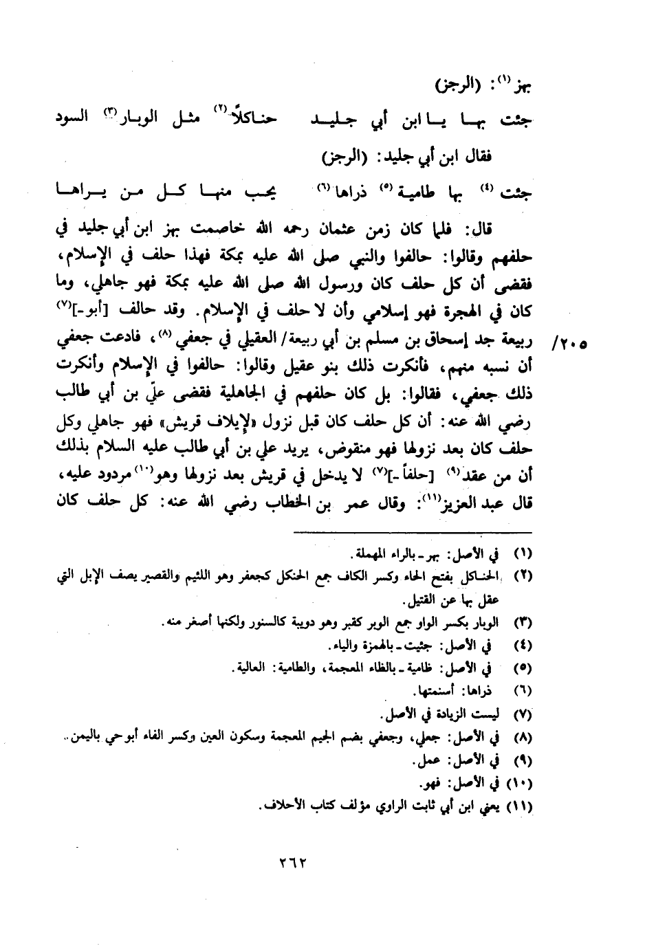 قال: فلما كان زمن عثمان رحمه الله خاصمت بهز ابن أبي جليد في حلفهم وقالوا: حالفوا والنبي صلى الله عليه بمكة فهذا حلف في الإسلام، فقضى أن كل حلف كان ورسول الله صلى الله عليه بمكة فهو جاهلي، وما كان في الهجرة فهو إسلامي وأن لا حلف في الإسلام. وقد حالف [أبو-] [7] ربيعة جد إسحاق بن مسلم بن أبي ربيعة/ العقيلي في جعفي [8] ، فادعت جعفي أن نسبه منهم، فأنكرت ذلك بنو عقيل وقالوا: حالفوا في الإسلام وأنكرت ذلك جعفي، فقالوا: بل كان حلفهم في الجاهلية فقضى عليّ بن أبي طالب رضي الله عنه: أن كل حلف كان قبل نزول «لإيلاف قريش» فهو جاهلي وكل حلف كان بعد نزولها فهو منقوض، يريد علي بن أبي طالب عليه السلام بذلك أن من عقد [9] [حلفا-] [7] لا يدخل في قريش بعد نزولها وهو [10] مردود عليه، قال عبد العزيز [11] : وقال عمر بن الخطاب رضي الله عنه: كل حلف كان