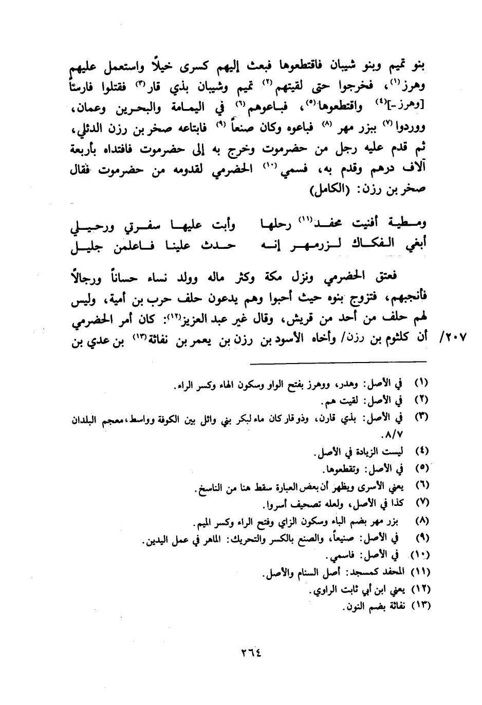 بنو تميم وبنو شيبان فاقتطعوها فبعث إليهم كسرى خيلا واستعمل عليهم وهرز [1] ، فخرجوا حتى لقيتهم [2] تميم وشيبان بذي قار [3] فقتلوا فارسا [وهرز-] [4] واقتطعوها [5] ، فباعوهم [6] في اليمامة والبحرين وعمان، ووردوا [7] ببزر مهر [8] فباعوه وكان صنعا [9] فابتاعه صخر بن رزن الدئلي، ثم قدم عليه رجل من حضرموت وخرج به إلى حضرموت فافتداه بأربعة آلاف درهم وقدم به، فسمي [10] الحضرمي لقدومه من حضرموت فقال صخر بن رزن: (الكامل)