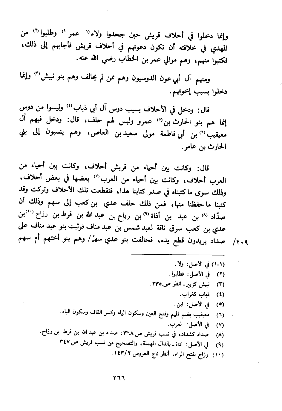قال: وكانت بين أحياء من قريش أحلاف، وكانت بين أحياء من العرب أحلاف، وكانت بين أحياء من العرب [7] بعضها في بعض أحلاف، وذلك سوى ما كتبناه في صدر كتابنا هذا، فتقطعت تلك الأحلاف وتركت وقد كتبنا ما حفظنا منها، فمن ذلك حلف عدي بن كعب إلى سهم وذلك أن صدّاد [8] بن عبد بن أذاة [9] بن رياح بن عبد الله بن قرط بن رزاح [10] بن عدي بن كعب سرق ناقة لعبد شمس بن عبد مناف فوثبت بنو عبد مناف على صداد يريدون قطع يده، فحالفت بنو عدي سهما وهم بنو أختهم أم سهم