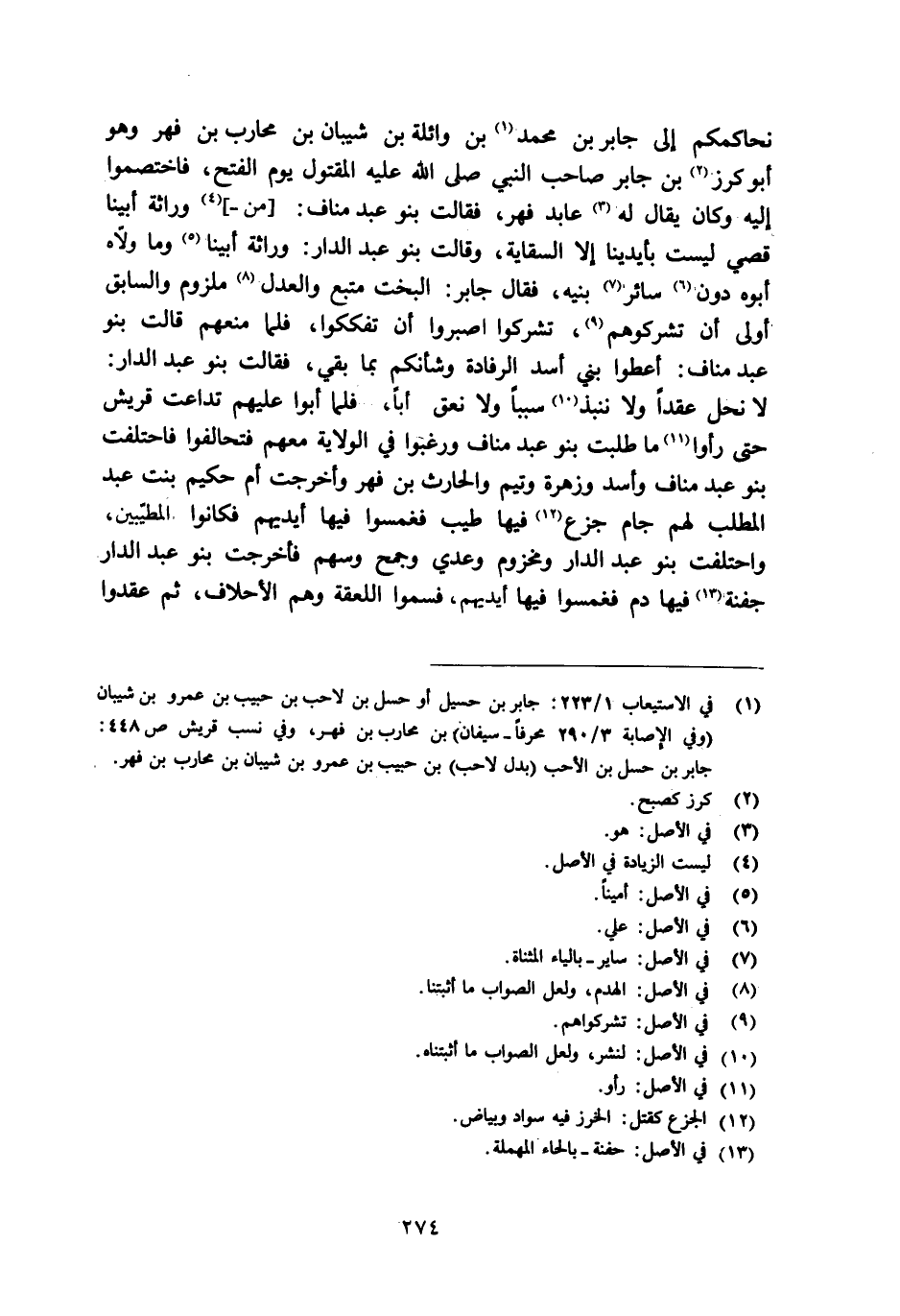 نحاكمكم إلى جابر بن محمد [1] بن وائلة بن شيبان بن محارب بن فهر وهو أبو كرز [2] بن جابر صاحب النبي صلى الله عليه المقتول يوم الفتح، فاختصموا إليه وكان يقال له [3] عابد فهر، فقالت بنو عبد مناف: [من-] [4] وراثة أبينا قصي ليست بأيدينا إلا السقاية، وقالت بنو عبد الدار: وراثة أبينا [5] وما ولّاه أبوه دون [6] سائر [7] بنيه، فقال جابر: البخت متبع والعدل [8] ملزوم والسابق أولى أن تشركوهم [9] ، تشركوا اصبروا أن تفككوا، فلما منعهم قالت بنو عبد مناف: أعطوا بني أسد الرفادة وشأنكم بما بقي، فقالت بنو عبد الدار: