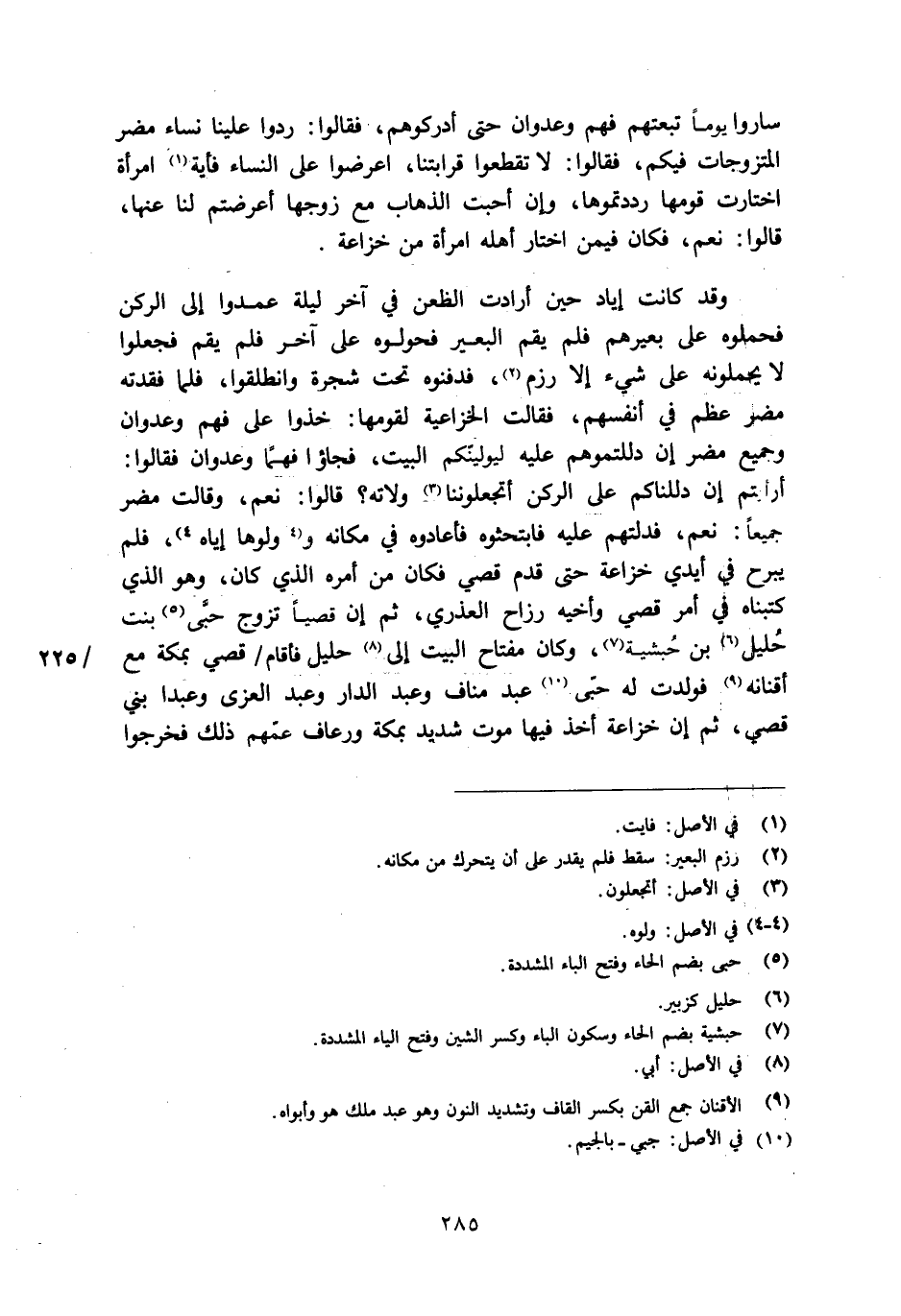 أرأيتم إن دللناكم على الركن أتجعلوننا [3] ولاته؟ قالوا: نعم، وقالت مضر جميعا: نعم، فدلتهم عليه فابتحثوه فأعادوه في مكانه و [4] ولوها إياه [4] ، فلم يبرح في أيدي خزاعة حتى قدم قصي فكان من أمره الذي كان، وهو الذي كتبناه في أمر قصي وأخيه رزاح العذري، ثم إن قصيا تزوج حبّى [5] بنت حليل [6] بن حبشية [7] ، وكان مفتاح البيت إلى [8] حليل فأقام قصي بمكة مع أقنانه [9] فولدت له حبّى [10] عبد مناف وعبد الدار وعبد العزى وعبدا بني قصي، ثم إن خزاعة أخذ فيها موت شديد بمكة ورعاف عمّهم ذلك فخرجوا