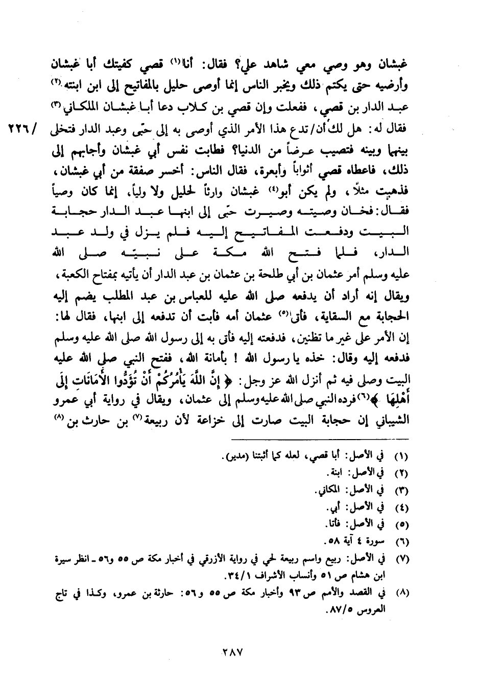 إن الأمر على غير ما تظنين، فدفعته إليه فأتى به إلى رسول الله صلى الله عليه وسلم فدفعه إليه وقال: خذه يا رسول الله! بأمانة الله، ففتح النبي صلى الله عليه البيت وصلى فيه ثم أنزل الله عز وجل: إِنَّ الله يَأْمُرُكُمْ أَنْ تُؤَدُّوا الْأَماناتِ إِلى أَهْلِها 4: 58 [6] فرده النبي صلى الله عليه وسلم إلى عثمان، ويقال في رواية أبي عمرو الشيباني إن حجابة البيت صارت إلى خزاعة لأن ربيعة [7] بن حارث بن [8]
