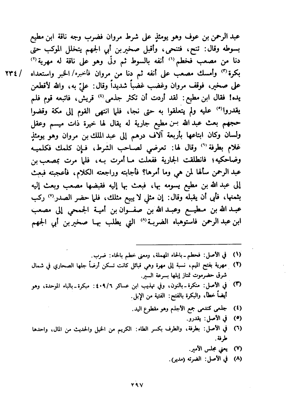 عبد الرحمن بن عوف وهو يومئذ على شرط مروان فضرب وجه ناقة ابن مطيع بسوطه وقال: تنح، فتنحى، وأقبل صخير بن أبي الجهم يتخلل الموكب حتى دنا من مصعب فخطم [1] أنفه بالسوط ثم ولّى وهو على ناقة له مهرية [2] بكرة [3] وأمسك مصعب على أنفه ثم دنا من مروان فأخبره الخبر واستعداه على صخير، فوقف مروان وغضب غضبا شديدا وقال: عليّ به، والله لأقطعن يده! فقال ابن مطيع: لقد أردت أن تكثر جذمي [4] قريش، فاتبعه قوم فلم يقدروا [5] عليه ولم يتعلقوا به حتى نجا، فلما انتهى القوم إلى مكة وقضوا حجهم بعث عبد الله بن مطيع جارية له يقال لها خيرة ذات ميسم وعقل ولسان وكان ابتاعها بأربعة آلاف درهم إلى عبد الملك بن مروان وهو يومئذ غلام بطرفة [6] وقال لها: تعرضي لصاحب الشرط، فإن كلمك فكلميه وضاحكيه، فانطلقت الجارية ففعلت ما أمرت به، فلما مرت بمصعب بن عبد الرحمن سألها لمن هي وما أمرها؟ فأجابته وراجعته الكلام، فأعجبته فبعث إلى عبد الله بن مطيع يسومه بها، فبعث بها إليه فقبضها مصعب وبعث إليه بثمنها، فأبى أن يقبله وقال: إن مثلي لا يبيع مثلك، فلما حضر الصدر [7] ركب عبد الله بن مطيع وعبد الله بن صفوان بن أمية الجمحي إلى مصعب ابن عبد الرحمن فاستوهباه الضربة [8] التي يطلب بها صخير بن أبي الجهم