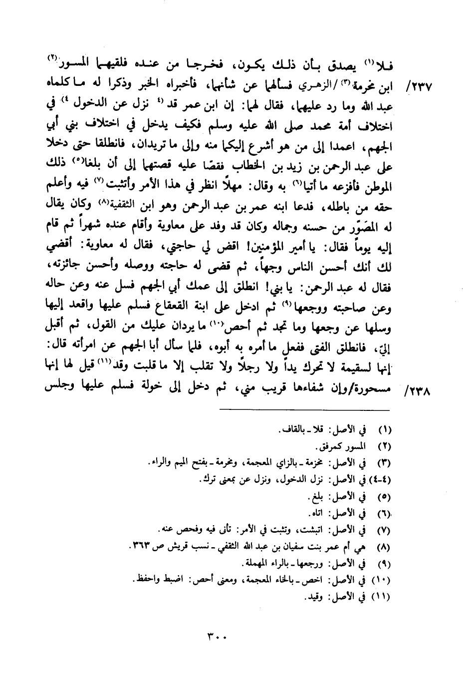فلا [1] يصدق بأن ذلك يكون، فخرجا من عنده فلقيهما المسور [2] ابن مخرمة [3] الزهري فسألهما عن شأنهما، فأخبراه الخبر وذكرا له ما كلماه عبد الله وما رد عليهما، فقال لهما: إن ابن عمر قد [4] نزل عن الدخول [4] في اختلاف أمة محمد صلى الله عليه وسلم فكيف يدخل في اختلاف بني أبي الجهم، اعمدا إلى من هو أشرع إليكما منه وإلى ما تريدان، فانطلقا حتى دخلا على عبد الرحمن بن زيد بن الخطاب فقصّا عليه قصتهما إلى أن بلغا [5] ذلك الموطن فأفزعه ما أتيا [6] به وقال: مهلا انظر في هذا الأمر وأتثبت [7] فيه وأعلم حقه من باطله، فدعا ابنه عمر بن عبد الرحمن وهو ابن الثقفية [8] وكان يقال له المصوّر من حسنه وجماله وكان قد وفد على معاوية وأقام عنده شهرا ثم قام إليه يوما فقال: يا أمير المؤمنين! اقض لي حاجتي، فقال له معاوية: أقضي لك أنك أحسن الناس وجها، ثم قضى له حاجته ووصله وأحسن جائزته، فقال له عبد الرحمن: يا بني! انطلق إلى عمك أبي الجهم فسل عنه وعن حاله وعن صاحبته ووجعها [9] ثم ادخل على ابنة القعقاع فسلم عليها واقعد إليها وسلها عن وجعها وما تجد ثم أحص [10] ما يردان عليك من القول، ثم أقبل إليّ، فانطلق الفتى ففعل ما أمره به أبوه، فلما سأل أبا الجهم عن امرأته قال: