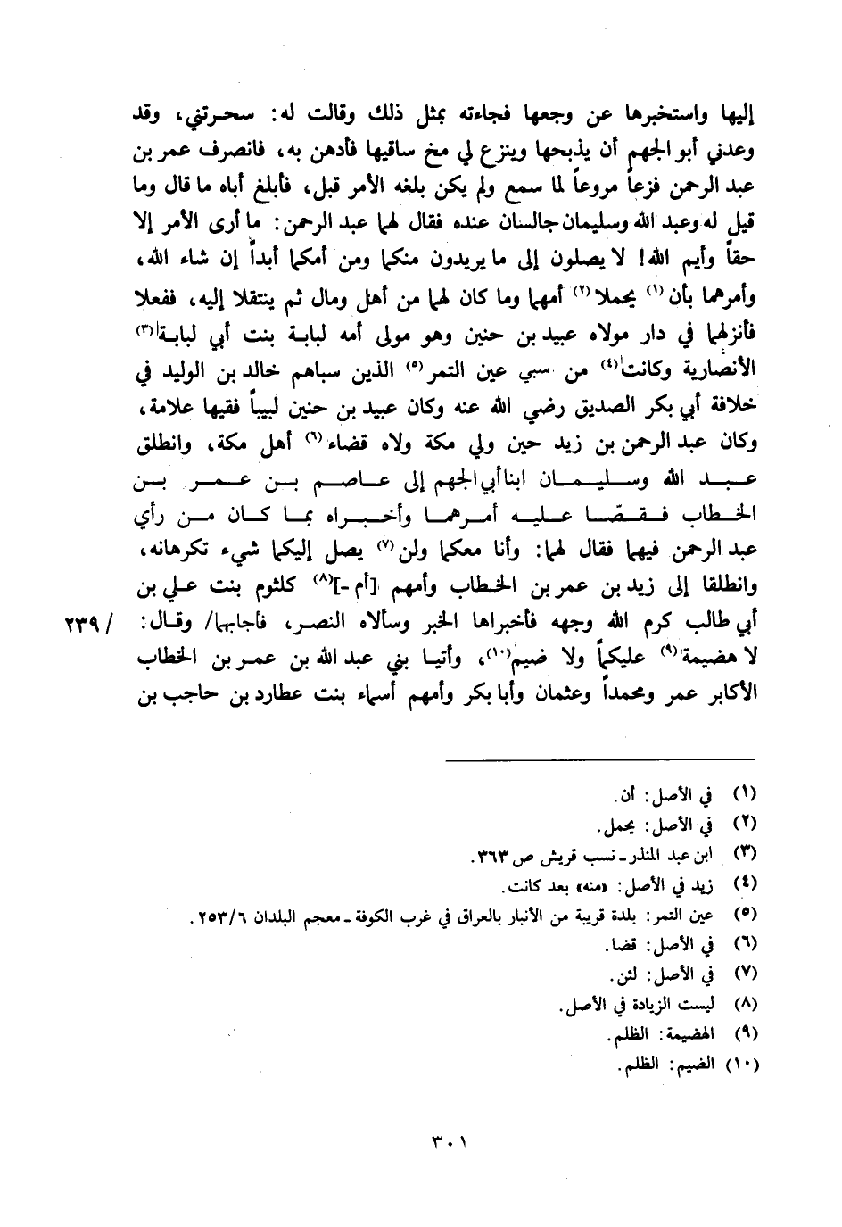 إليها واستخبرها عن وجعها فجاءته بمثل ذلك وقالت له: سحرتني، وقد وعدني أبو الجهم أن يذبحها وينزع لي مخ ساقيها فأدهن به، فانصرف عمر بن عبد الرحمن فزعا مروعا لما سمع ولم يكن بلغه الأمر قبل، فأبلغ أباه ما قال وما قيل له وعبد الله وسليمان جالسان عنده فقال لهما عبد الرحمن: ما أرى الأمر إلا حقا وأيم الله! لا يصلون إلى ما يريدون منكما ومن أمكما أبدا إن شاء الله، وأمرهما بأن [1] يحملا [2] أمهما وما كان لهما من أهل ومال ثم ينتقلا إليه، ففعلا فأنزلهما في دار مولاه عبيد بن حنين وهو مولى أمه لبابة بنت أبي لبابة [3] الأنصارية وكانت [4] من سبي عين التمر [5] الذين سباهم خالد بن الوليد في خلافة أبي بكر الصديق رضي الله عنه وكان عبيد بن حنين لبيبا فقيها علامة، وكان عبد الرحمن بن زيد حين ولي مكة ولاه قضاء [6] أهل مكة، وانطلق عبد الله وسليمان ابنا أبي الجهم إلى عاصم بن عمر بن الخطاب فقصّا عليه أمرهما وأخبراه بما كان من رأي عبد الرحمن فيهما فقال لهما: وأنا معكما ولن [7] يصل إليكما شيء تكرهانه، وانطلقا إلى زيد بن عمر بن الخطاب وأمهم [أم-] [8] كلثوم بنت علي بن أبي طالب كرم الله وجهه فأخبراها الخبر وسألاه النصر، فأجابهما وقال: