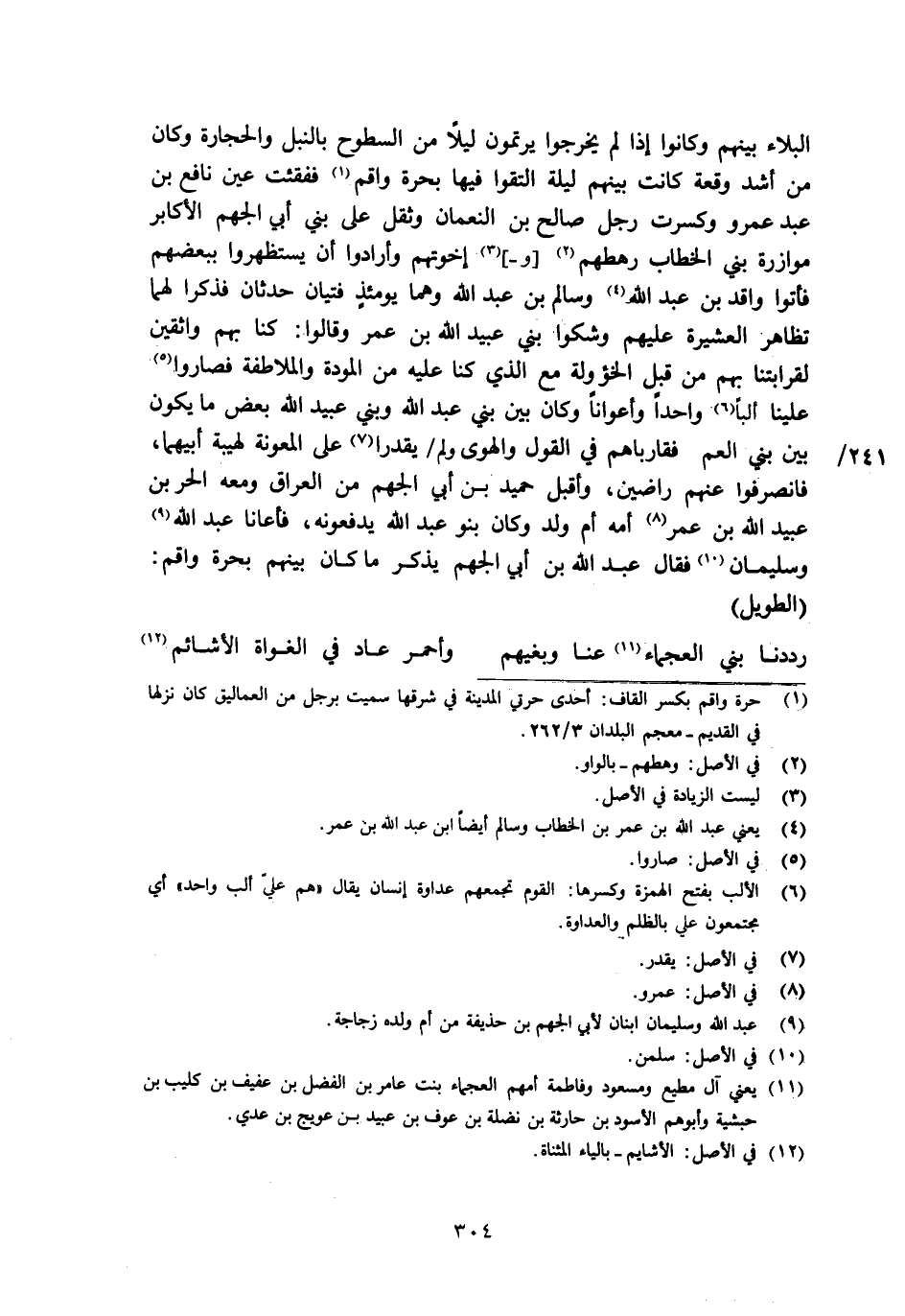 البلاء بينهم وكانوا إذا لم يخرجوا يرتمون ليلا من السطوح بالنبل والحجارة وكان من أشد وقعة كانت بينهم ليلة التقوا فيها بحرة وأقم [1] ففقئت عين نافع بن عبد عمرو وكسرت رجل صالح بن النعمان وثقل على بني أبي الجهم الأكابر موازرة بني الخطاب رهطهم [2] [و-] [3] إخوتهم وأرادوا أن يستظهروا ببعضهم فأتوا واقد بن عبد الله [4] وسالم بن عبد الله وهما يومئذ فتيان حدثان فذكرا لهما تظاهر العشيرة عليهم وشكوا بني عبيد الله بن عمر وقالوا: كنا بهم واثقين لقرابتنا بهم من قبل الخؤولة مع الذي كنا عليه من المودة والملاطفة فصاروا [5] علينا ألبا [6] واحدا وأعوانا وكان بين بني عبد الله وبني عبيد الله بعض ما يكون بين بني العم فقارباهم في القول والهوى ولم يقدرا [7] على المعونة لهيبة أبيهما، فانصرفوا عنهم راضين، وأقبل حميد بن أبي الجهم من العراق ومعه الحر بن عبيد الله بن عمر [8] أمه أم ولد وكان بنو عبد الله يدفعونه، فأعانا عبد الله [9] وسليمان [10] فقال عبد الله بن أبي الجهم يذكر ما كان بينهم بحرة واقم: