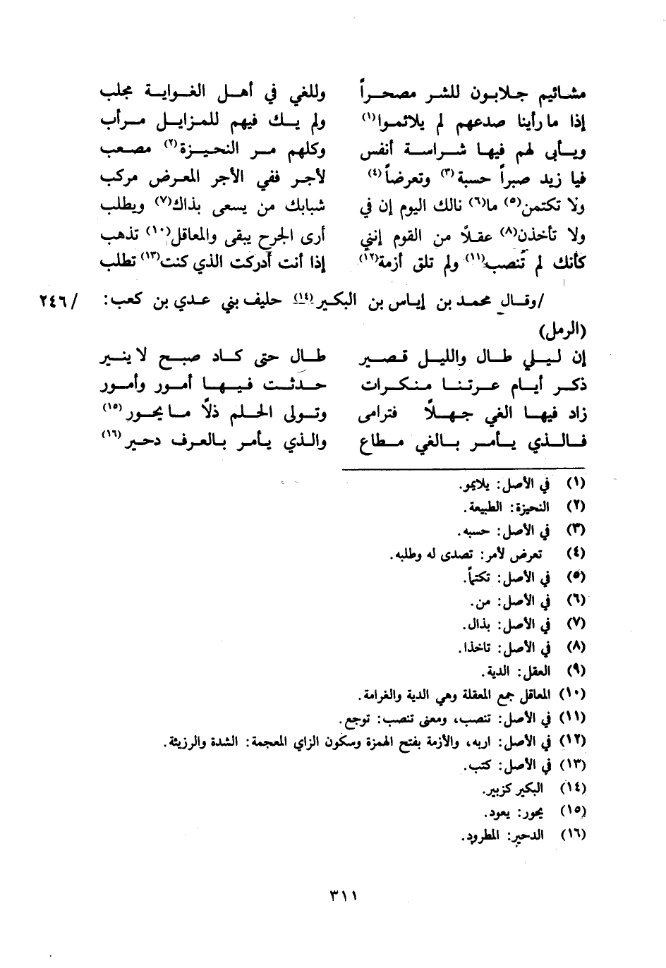 ولا تأخذن [8] عقلا [9] من القوم إنني ... أرى الجرح يبقى والمعاقل [10] تذهب