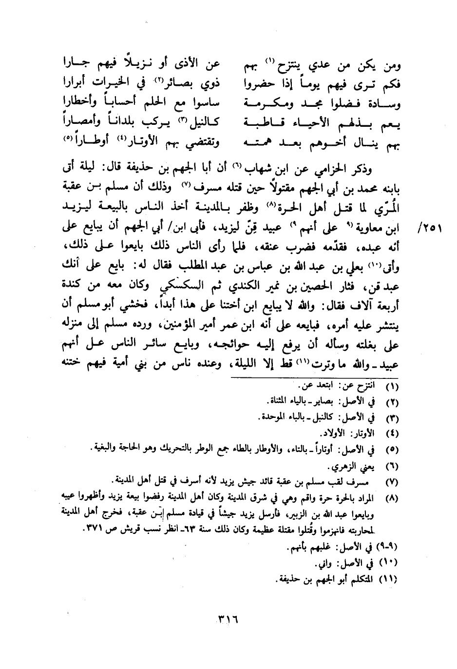 [8] المراد بالحرة حرة واقم وهي في شرق المدينة وكان أهل المدينة رفضوا بيعة يزيد وأظهروا عيبه وبايعوا عبد الله بن الزبير، فأرسل يزيد جيشا في قيادة مسلم بن عقبة، فخرج أهل المدينة لمحاربته فانهزموا وقتلوا مقتلة عظيمة وكان ذلك سنة 63- انظر نسب قريش ص 371.