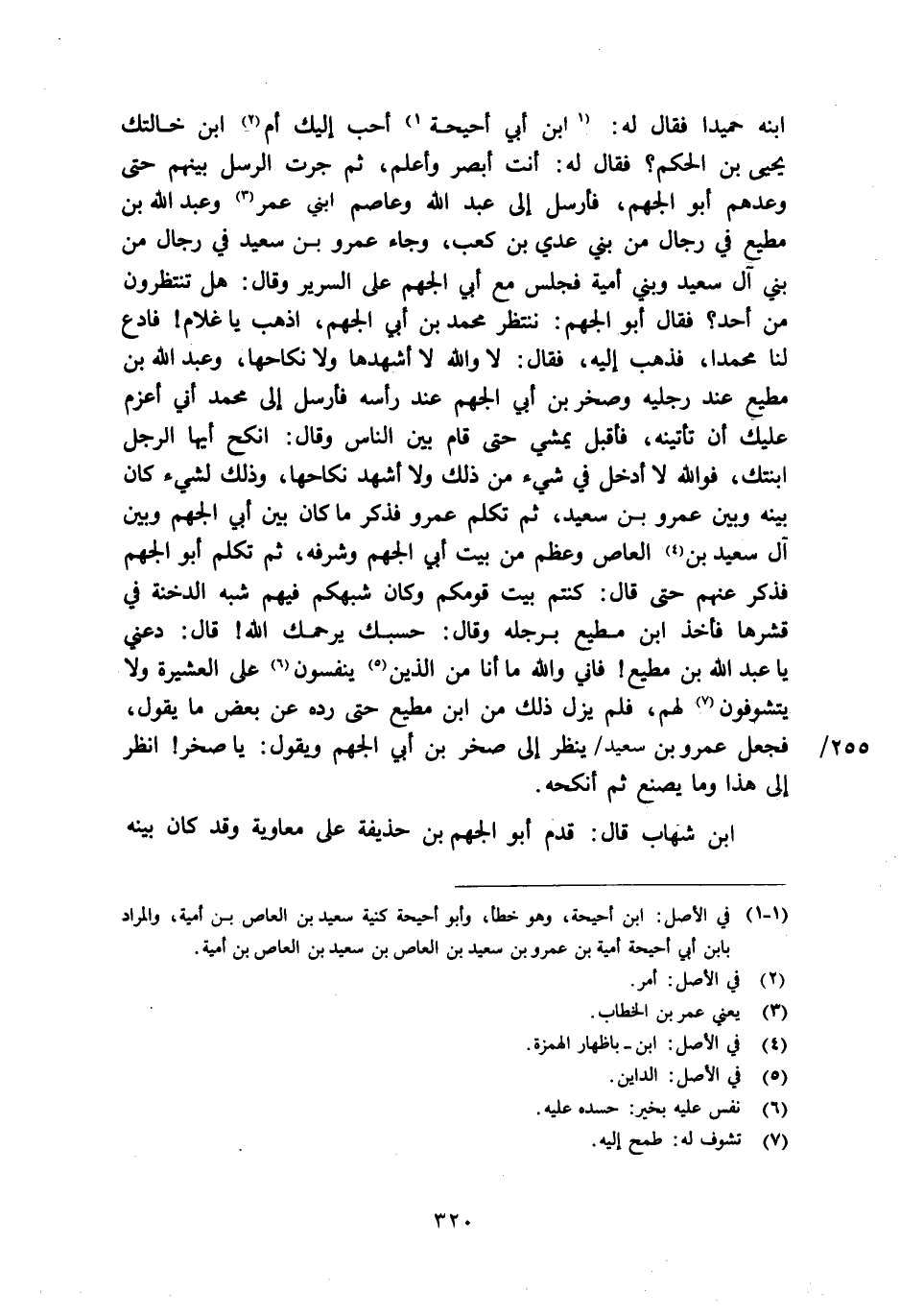 ابنه حميدا فقال له: [1] ابن أبي أحيحة [1] أحب إليك أم [2] ابن خالتك يحيى بن الحكم؟ فقال له: أنت أبصر وأعلم، ثم جرت الرسل بينهم حتى وعدهم أبو الجهم، فأرسل إلى عبد الله وعاصم ابني عمر [3] وعبد الله بن مطيع في رجال من بني عدي بن كعب، وجاء عمرو بن سعيد في رجال من بني آل سعيد وبني أمية فجلس مع أبي الجهم على السرير وقال: هل تنتظرون من أحد؟ فقال أبو الجهم: ننتظر محمد بن أبي الجهم، اذهب يا غلام! فادع لنا محمدا، فذهب إليه، فقال: لا والله لا أشهدها ولا نكاحها، وعبد الله بن مطيع عند رجليه وصخر بن أبي الجهم عند رأسه فأرسل إلى محمد أني أعزم عليك أن تأتينه، فأقبل يمشي حتى قام بين الناس وقال: انكح أيها الرجل ابنتك، فو الله لا أدخل في شيء من ذلك ولا أشهد نكاحها، وذلك لشيء كان بينه وبين عمرو بن سعيد، ثم تكلم عمرو فذكر ما كان بين أبي الجهم وبين آل سعيد بن [4] العاص وعظم من بيت أبي الجهم وشرفه، ثم تكلم أبو الجهم فذكر عنهم حتى قال: كنتم بيت قومكم وكان شبهكم فيهم شبه الدخنة في قشرها فأخذ ابن مطيع برجله وقال: حسبك يرحمك الله! قال: دعني يا عبد الله بن مطيع! فاني والله ما أنا من الذين [5] ينفسون [6] على العشيرة ولا يتشوفون [7] لهم، فلم يزل ذلك من ابن مطيع حتى رده عن بعض ما يقول، فجعل عمرو بن سعيد ينظر إلى صخر بن أبي الجهم ويقول: يا صخر! انظر إلى هذا وما يصنع ثم أنكحه.
