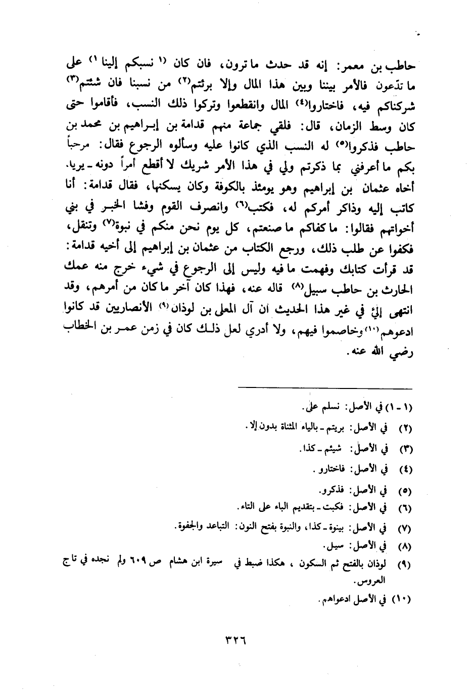 حاطب بن معمر: إنه قد حدث ما ترون، فان كان [1] نسبكم إلينا [1] على ما تدّعون فالأمر بيننا وبين هذا المال وإلا برئتم [2] من نسبنا فان شئتم [3] شركناكم فيه، فاختاروا [4] المال وانقطعوا وتركوا ذلك النسب، فأقاموا حتى كان وسط الزمان، قال: فلقي جماعة منهم قدامة بن إبراهيم بن محمد بن حاطب فذكروا [5] له النسب الذي كانوا عليه وسألوه الرجوع فقال: مرحبا بكم ما أعرفني بما ذكرتم ولي في هذا الأمر شريك لا أقطع أمرا دونه- يريد أخاه عثمان بن إبراهيم وهو يومئذ بالكوفة وكان يسكنها، فقال قدامة: أنا كاتب إليه وذاكر أمركم له، فكتب [6] وانصرف القوم وفشا الخبر في بني أخواتهم فقالوا: ما كفاكم ما صنعتم، كل يوم نحن منكم في نبوة [7] وتنقل، فكفوا عن طلب ذلك، ورجع الكتاب من عثمان بن إبراهيم إلى أخيه قدامة: