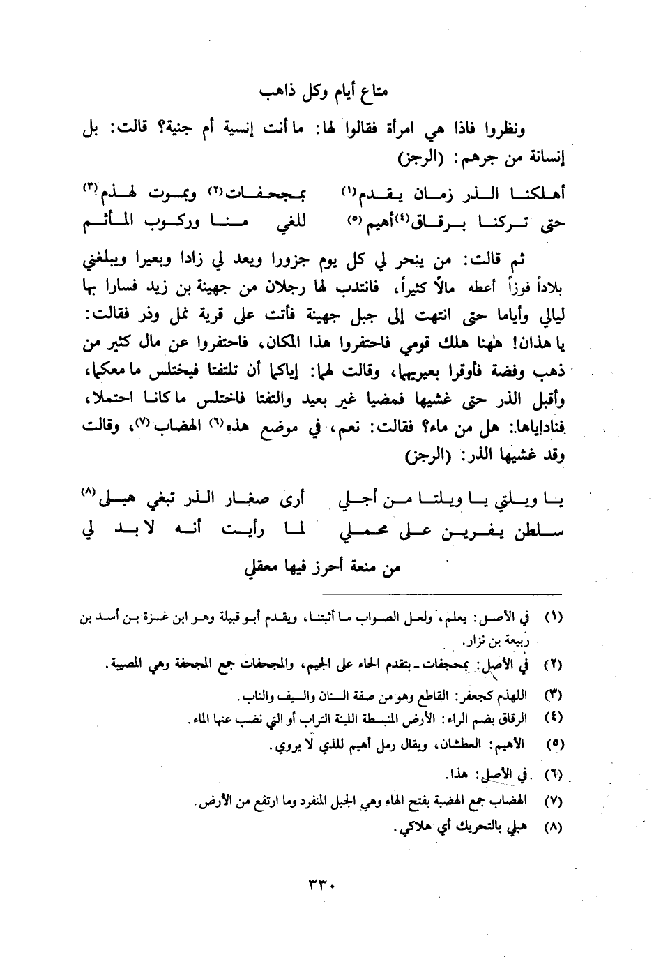 ونظروا فإذا هي امرأة فقالوا لها: ما أنت إنسية أم جنية؟ قالت: بل إنسانة من جرهم: (الرجز)