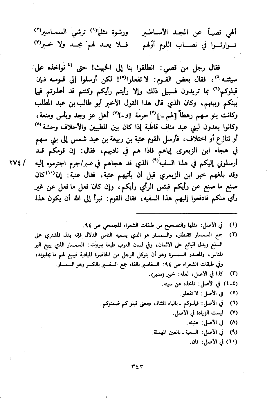 فقال رجل من قصي: انطلقوا بنا إلى الخبيث! حتى [4] نواخذه على سيئته [4] ، فقال بعض القوم: لا تفعلوا [5] ! لكن أرسلوا إلى قومه فإن قبلوكم [6] بما تريدون فسبيل ذلك وإلا رأيتم رأيكم وكنتم قد أعذرتم فيما بينكم وبينهم، وكان الذي قال هذا القول الأخير أبو طالب بن عبد المطلب وكانت بنو سهم رهطا [لهم-] [7] حرمة [و-] [7] أهل عز وجد وبأس ومنعة، وكانوا يعدون لبني عبد مناف قاطبة إذا كان بين المطيبين والأحلاف وحشة [8] أو تنازع أو اختلاف، فأرسل القوم عتبة بن ربيعة بن عبد شمس إلى بني سهم في هجاء ابن الزبعرى إياهم فإذا هم في ناديهم، فقال: إن قومكم قد أرسلوني إليكم في هذا السفيه [9] الذي قد هجاهم في غير/ جرم اجترموه إليه وقد بلغهم خبر ابن الزبعري قبل أن يأتيهم عتبة، فقال عتبة: إن [10] كان صنع ما صنع عن رأيكم فبئس الرأي رأيكم، وإن كان فعل ما فعل عن غير رأي منكم فادفعوا إليهم هذا السفيه، فقال القوم: نبرأ إلى الله أن يكون هذا