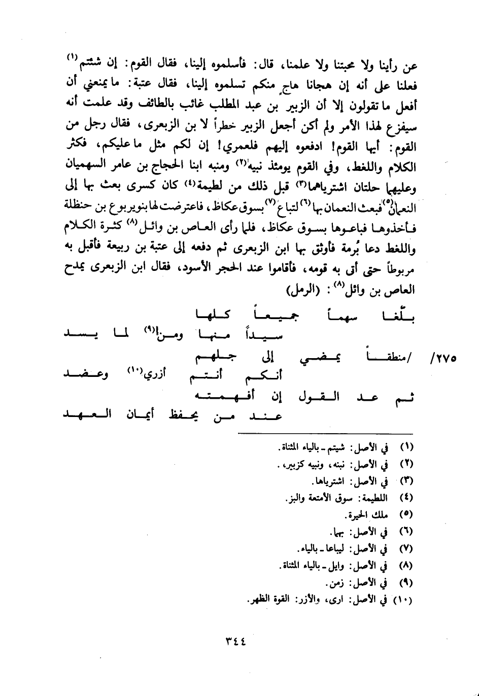 عن رأينا ولا محبتنا ولا علمنا، قال: فأسلموه إلينا، فقال القوم: إن شئتم [1] فعلنا على أنه إن هجانا هاج منكم تسلموه إلينا، فقال عتبة: ما يمنعني أن أفعل ما تقولون إلا أن الزبير بن عبد المطلب غائب بالطائف وقد علمت أنه سيفزع لهذا الأمر ولم أكن أجعل الزبير خطرا لا بن الزبعرى، فقال رجل من القوم: أيها القوم! ادفعوه إليهم فلعمري! إن لكم مثل ما عليكم، فكثر الكلام واللغط، وفي القوم يومئذ نبيه [2] ومنبه ابنا الحجاج بن عامر السهميان وعليهما حلتان اشترياهما [3] قبل ذلك من لطيمة [4] كان كسرى بعث بها إلى النعمان [5] فبعث النعمان بها [6] لتباع [7] بسوق عكاظ، فاعترضت لها بنو يربوع بن حنظلة فأخذوها فباعوها بسوق عكاظ، فلما رأى العاص بن وائل [8] كثرة الكلام واللغط دعا برمة فأوثق بها ابن الزبعرى ثم دفعه إلى عتبة بن ربيعة فأقبل به مربوطا حتى أتى به قومه، فأقاموا عند الحجر الأسود، فقال ابن الزبعرى يمدح العاص بن وائل [8] : (الرمل)