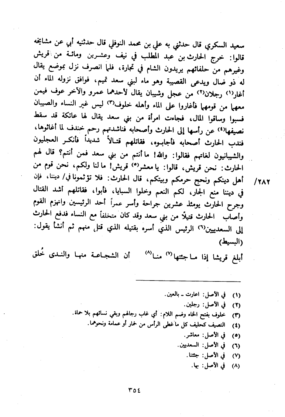 سعيد السكري قال حدثني به علي بن محمد النوفلي قال حدثنيه أبي عن مشايخه قالوا: خرج الحارث بن عبد المطلب في نيف وعشرين ومائة من قريش وغيرهم من حلفائهم يريدون الشام في تجارة، فلما انصرف نزل بموضع يقال له ذو ضال ويدعى القصيبة وهو ماء لبني سعد تميم، فوافق نزوله الماء أن أغار [1] رجلان [2] من عجل وشيبان يقال لأحدهما عمرو والآخر عوف فيمن معهما من قومهما فأغاروا على الماء وأهله خلوف [3] ليس غير النساء والصيبان فسبوا وساقوا المال، فجاءت امرأة من بني سعد يقال لها عاتكة قد سقط نصيفها [4] عن رأسها إلى الحارث وأصحابه فناشدتهم رحم خندف لما أغاثوها، فندب الحارث أصحابه فأجابوه، فقاتلهم قتالا شديدا فأنكر العجليون والشيبانيون لغاتهم فقالوا: والله! ما أنتم من بني سعد فمن أنتم؟ قال لهم الحارث: نحن قريش، قالوا: يا معشر [5] قريش! ما لنا ولكم، نحن قوم من أهل دينكم ونحج حرمكم وبيتكم، قال الحارث: فلا تؤثمونا في/ ديننا، فإن في ديننا منع الجار، لكم النعم وخلوا السبايا، فأبوا، فقاتلهم أشد القتال وجرح الحارث يومئذ عشرين جراحة وأسر عمرا أحد الرئيسين وانهزم القوم وأصاب الحارث قتيلا من بني سعد وقد كان متخلفا مع النساء فدفع الحارث إلى السعديين [6] الرئيس الذي أسره بقتيله الذي قتل منهم ثم أنشأ يقول: