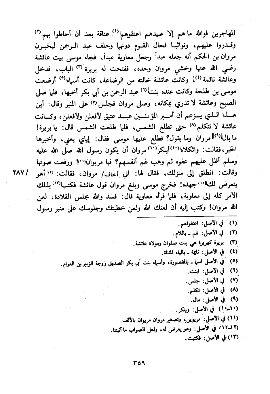 المهاجرين فو الله ما هم إلا عبيدهم اعتقوهم [1] عتاقة بعد أن أحاطوا بهم [2] وقدروا عليهم، وتواثبا فحال القوم دونهما وحلف عبد الرحمن ليخبرن مروان بن الحكم أنه جعله عبدا وجعل معاوية عبدا، فجاء موسى بيت عائشة رضي الله عنها وخشي مروان وحده، ففتحت له بريرة [3] الباب، فدخل وعائشة نائمة [4] ، وكانت عائشة خالته من الرضاعة، كانت أسماء [5] أرضعت موسى بن طلحة وكانت عنده بنت [6] عبد الرحمن بن أبي بكر أخيها، فلما صلى الصبح وعائشة لا تدري بمكانه، وصلى مروان فجلس [7] على المنبر وقال: أين هذا الذي يزعم أن أمير المؤمنين عبد عتيق لأفعلن ولأفعلن، وكانت عائشة لا تتكلم [8] حتى تطلع الشمس، فلما طلعت الشمس قال: يا بريرة! ما بال [9] مروان وما يقول؟ فطلع عليها موسى فقال: إياي يعني، وأخبرها الخبر، فقالت: وا ثكلاه [10] أينكر [10] مروان أن يكون رسول الله صلى الله عليه وسلم أظل عليهم عفوه ثم وهب لهم أنفسهم؟ فيا مريوان [11] ! ورفعت صوتها وقالت: انطلق إلى منزلك، فقال لها: اني أخاف/ مروان، فقالت: [12] أهو يتعرض لك [12] جهده! فخرج موسى وبلغ مروان قول عائشة فكتب [13] بذلك الأمر كله إلى معاوية، فلما قرأه معاوية قال: فسد والله مجلس القلادة، لعن الله مروان! وكتب إليه أن لعنك الله ولعن خطبتك وجلوسك على منبر رسول