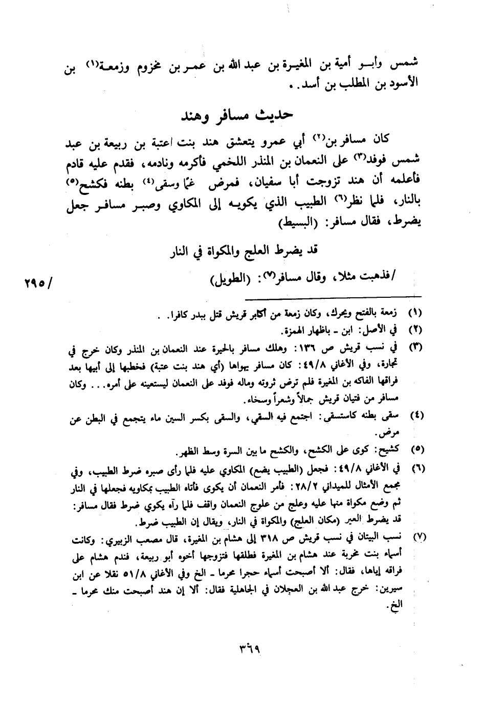 [3] في نسب قريش ص 136: وهلك مسافر بالحيرة عند النعمان بن المنذر وكان خرج في تجارة، وفي الأغاني 8/ 49: كان مسافر يهواها (أي هند بنت عتبة) فخطبها إلى أبيها بعد فراقها الفاكه بن المغيرة فلم ترض ثروته وماله فوفد على النعمان ليستعينه على أمره ... وكان مسافر من فتيان قريش جمالا وشعرا وسخاء.