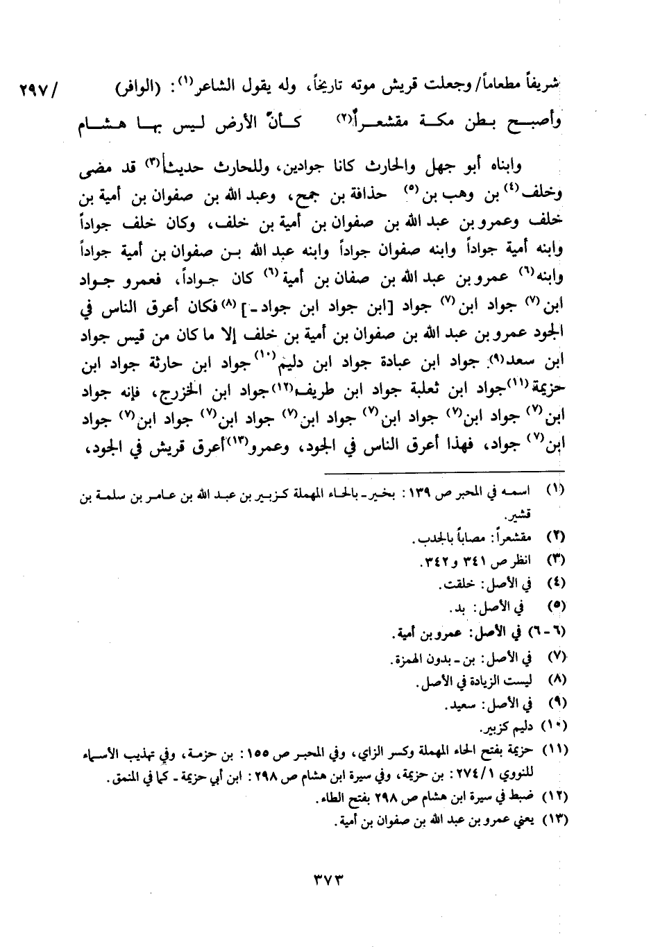 وابناه أبو جهل والحارث كانا جوادين، وللحارث حديث [3] قد مضى وخلف [4] بن وهب بن [5] حذافة بن جمح، وعبد الله بن صفوان بن أمية بن خلف وعمرو بن عبد الله بن صفوان بن أمية بن خلف، وكان خلف جوادا وابنه أمية جوادا وابنه صفوان جوادا وابنه عبد الله بن صفوان بن أمية جوادا وابنه [6] عمرو بن عبد الله بن صفان بن أمية [6] كان جوادا، فعمرو جواد ابن [7] جواد ابن [7] جواد [ابن جواد ابن جواد-] [8] فكان أعرق الناس في الجود عمرو بن عبد الله بن صفوان بن أمية بن خلف إلا ما كان من قيس جواد ابن سعد [9] جواد ابن عبادة جواد ابن دليم [10] جواد ابن حارثة جواد ابن حزيمة [11] جواد ابن ثعلبة جواد ابن طريف [12] جواد ابن الخزرج، فإنه جواد ابن [7] جواد ابن [7] جواد ابن [7] جواد ابن [7] جواد ابن [7] جواد ابن [7] جواد ابن [7] جواد، فهذا أعرق الناس في الجود، وعمرو [13] أعرق قريش في الجود،