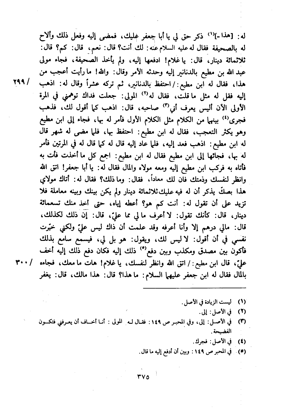 ثلاثمائة دينار، قال: يا غلام! ادفعها إليه، ولم يأخذ الصحيفة، فجاء مولى عبد الله بن مطيع بالدنانير إليه وحدثه الأمر وقال: والله! ما رأيت أعجب من هذا، فقال له ابن مطيع:/ احتفظ بالدنانير، ثم تركه عشرا وقال له: اذهب إليه فقل له مثل ما قلت، فقال له [2] المولى: جعلت فداك توهمني في المرة الأولى الآن أليس يعرف أني [3] صاحبه، قال: اذهب كما أقول لك، فذهب فجرى [4] بينهما من الكلام مثل الكلام الأول فأمر له بها، فجاء إلى ابن مطيع وهو يكثر التعجب، فقال له ابن مطيع: احتفظ بها، فلما مضى له شهر قال له ابن مطيع: اذهب فعد إليه، فلما عاد إليه قال له كما قال له في المرتين فأمر له بها، فجائها إلى ابن مطيع فقال له ابن مطيع: اجمع كل ما أخذت فأت به فأتاه به فركب ابن مطيع إليه ومعه مولاه والمال فقال له: يا أبا جعفر! اتق الله وانظر لنفسك وذمتك فان لك معادا، فقال: وما ذلك؟ فقال له: أتاك مولاي هذا بصكّ يذكر أن له فيه عليك ثلاثمائة دينار ولم يكن بينك وبينه معاملة فلا تزيد على أن تقول له: أنت كم هو؟ أعطه إياه، حتى أخذ منك تسعمائة دينار، قال: كأنك تقول: لا أعرف ما لي مما عليّ، قال: إن ذلك لكذلك، قال: مالي درهم إلا وأنا أعرفه وقد علمت أن ذاك ليس عليّ ولكني خيّرت نفسي في أن أقول: لا ليس لك، ويقول: هو بل لي، فيسمع سامع بذلك فأكون بين مصدق ومكذب وبين دفع [5] ذلك إليه فكان دفع ذلك إليه أخف عليّ، قال ابن مطيع:/ اتق الله وانظر لنفسك، يا غلام! هات ما معك، فجاءه بالمال فقال له ابن جعفر عليهما السلام: ما هذا؟ قال: هذا مالك، قال: يغفر
