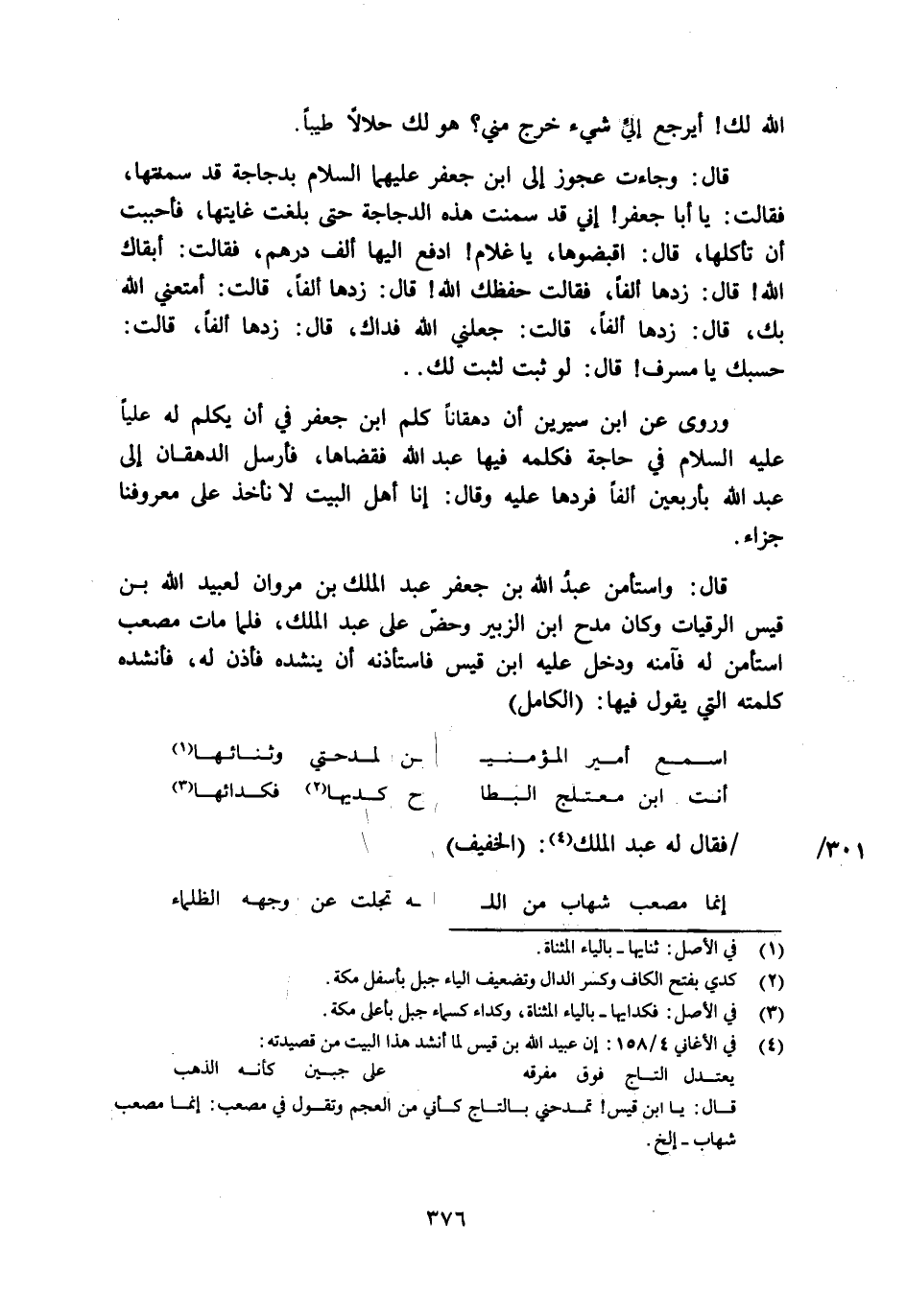 قال: يا ابن قيس! تمدحني بالتاج كأني من العجم وتقول في مصعب: إنما مصعب شهاب- إلخ.