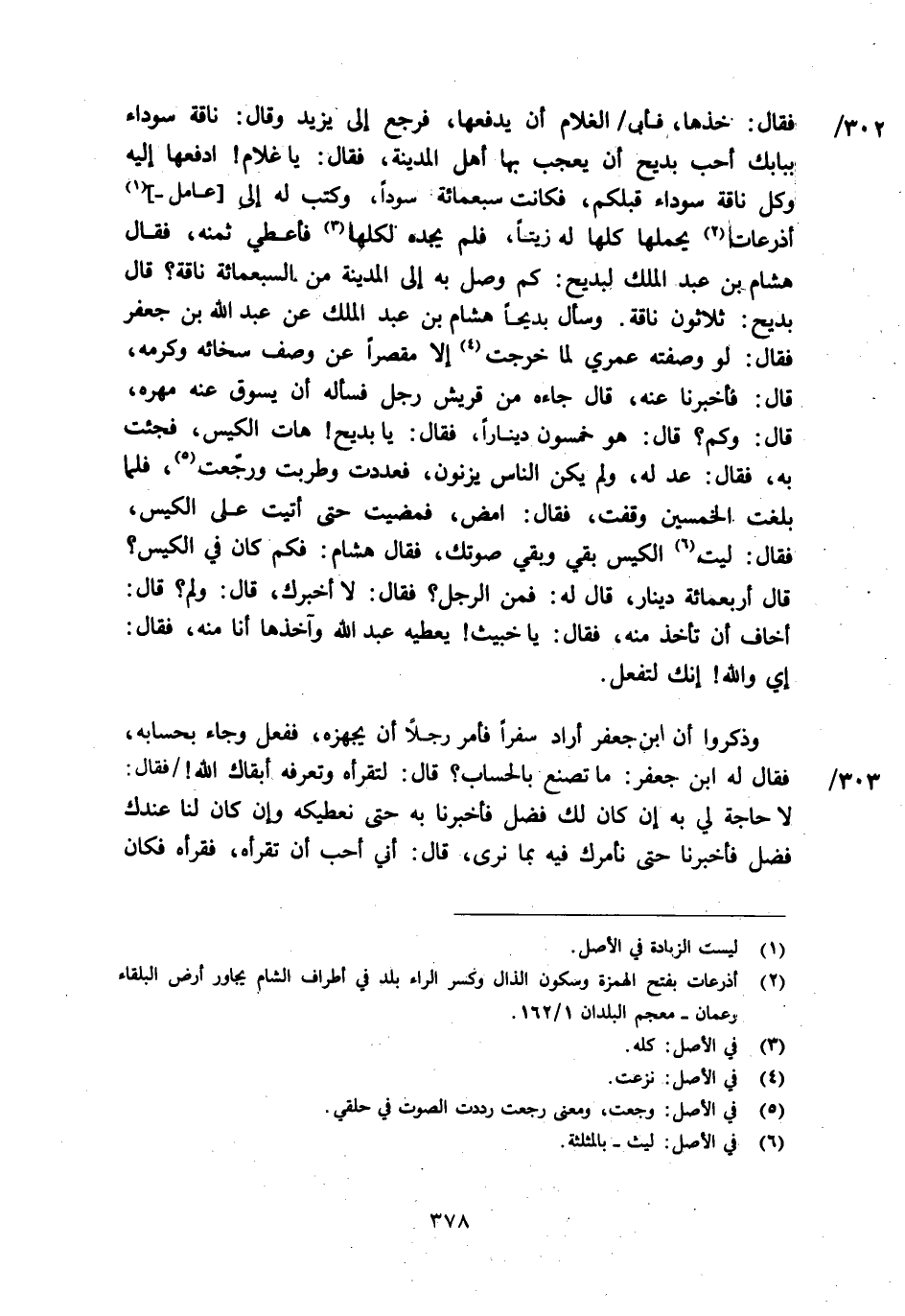 فقال: خذها، فأبي/ الغلام أن يدفعها، فرجع إلى يزيد وقال: ناقة سوداء ببابك أحب بديح أن يعجب بها أهل المدينة، فقال: يا غلام! ادفعها إليه وكل ناقة سوداء قبلكم، فكانت سبعمائة سودا، وكتب له إلى [عامل-] [1] أذرعات [2] يحملها كلها له زيتا، فلم يجده لكلها [3] فأعطي ثمنه، فقال هشام بن عبد الملك لبديح: كم وصل به إلى المدينة من السبعمائة ناقة؟ قال بديح: ثلاثون ناقة. وسأل بديحا هشام بن عبد الملك عن عبد الله بن جعفر فقال: لو وصفته عمري لما خرجت [4] إلا مقصرا عن وصف سخائه وكرمه، قال: فأخبرنا عنه، قال جاءه من قريش رجل فسأله أن يسوق عنه مهره، قال: وكم؟ قال: هو خمسون دينارا، فقال: يا بديح! هات الكيس، فجئت به، فقال: عد له، ولم يكن الناس يزنون، فعددت وطربت ورجّعت [5] ، فلما بلغت الخمسين وقفت، فقال: امض، فمضيت حتى أتيت على الكيس، فقال: ليت [6] الكيس بقي وبقي صوتك، فقال هشام: فكم كان في الكيس؟