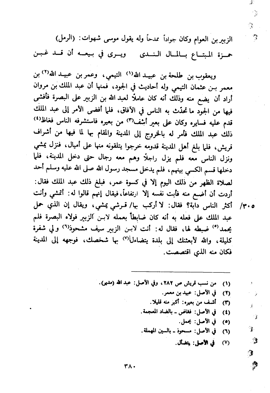 أردت أن أضع منه فأبت نفسه إلا ارتفاعا، فيقال إنهم قالوا له: أتمشي وأنت أكثر الناس دابة؟ فقال: لا أركب بها/ قرشي يمشي، ويقال إن الذي حمل عبد الملك على فعله به أنه كان ضابطا بعمله لابن الزبير فولاه البصرة فلم يحمد [5] ضبطه لها، فقال له: أنت لابن الزبير سيف مشحوذ [6] ولي شفرة كليلة، والله لأبعثنك إلى بلدة يتضاءل [7] بها شخصك، فوجهه إلى المدينة فكان منه الذي اقتصصت.