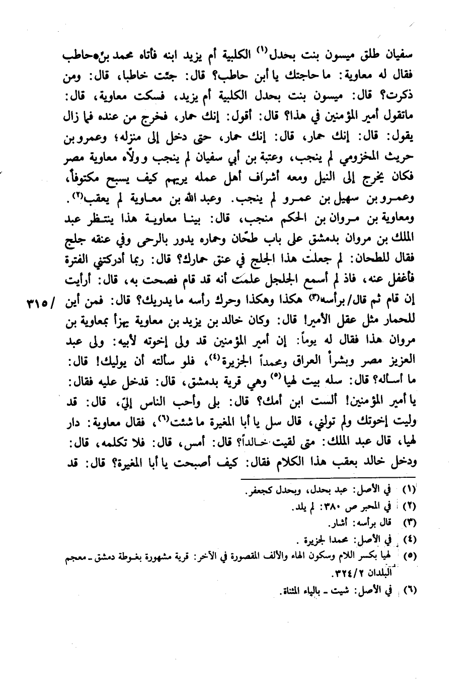 سفيان طلق ميسون بنت بحدل [1] الكلبية أم يزيد ابنه فأتاه محمد بن حاطب فقال له معاوية: ما حاجتك يا أبن حاطب؟ قال: جئت خاطبا، قال: ومن ذكرت؟ قال: ميسون بنت بحدل الكلبية أم يزيد، فسكت معاوية، قال: