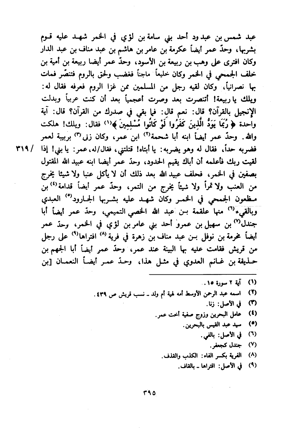 ويلك يا ربيعة! أتنصرت بعد وصرت أعجميا بعد أن كنت عربيا وبدلت الإنجيل بالقرآن؟ قال: نعم قال: فما بقي في صدرك من القرآن؟ قال: آية واحدة رُبَما يَوَدُّ الَّذِينَ كَفَرُوا لَوْ كانُوا مُسْلِمِينَ 15: 2 [1] فقال: ويلك! هلكت والله. وحدّ عمر أيضا ابنه أبا شحمة [2] ابن عمر، وكان زنى [3] بربيبة لعمر فضربه حدا، فقال له وهو يضربه: يا أبتاه! قتلتني، فقال/ له، عمر: يا بني! إذا لقيت ربك فأعلمه أن أباك يقيم الحدود، وحدّ عمر أيضا ابنه عبيد الله المقتول بصفين في الخمر، فحلف عبيد الله بعد ذلك أن لا يأكل عنبا ولا شيئا يخرج من العنب ولا تمرا ولا شيئا يخرج من التمر، وحدّ عمر أيضا قدامة [4] بن مظعون الجمحي في الخمر وكان شهد عليه بشربها الجارود [5] العبدي وبالقيء [6] منها علقمة بن عبد الله الخصي التميمي، وحدّ عمر أيضا أبا جندل [7] بن سهيل بن عمرو أحد بني عامر بن لؤي في الخمر، وحدّ عمر أيضا مخرمة بن نوفل بن عبد مناف بن زهرة في فرية [8] افتراها [9] على رجل من قريش فقامت عليه بها البينة عند عمر، وحدّ عمر أيضا أبا الجهم بن حذيفة بن غانم العدوي في مثل هذا، وحدّ عمر أيضا النعمان [بن