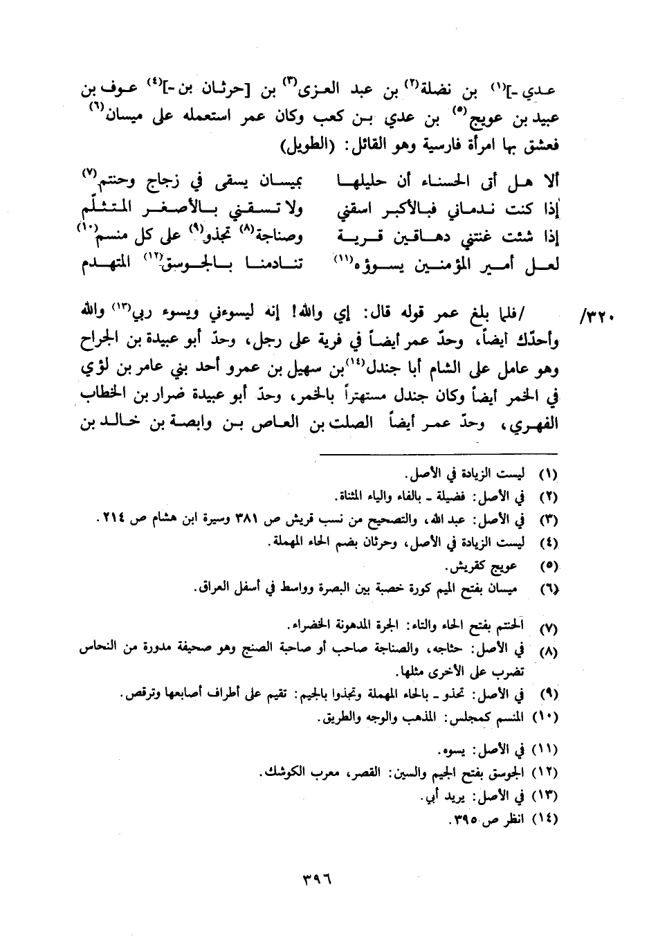 عدي-] [1] بن نضلة [2] بن عبد العزى [3] بن [حرثان بن-] [4] عوف بن عبيد بن عويج [5] بن عدي بن كعب وكان عمر استعمله على ميسان [6] فعشق بها امرأة فارسية وهو القائل: (الطويل)