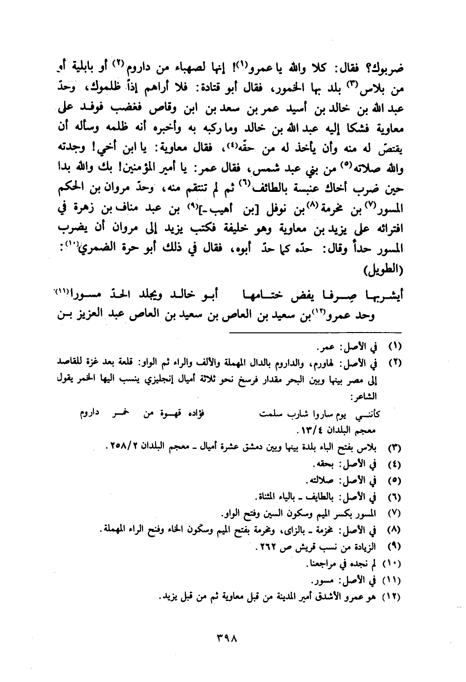 ضربوك؟ فقال: كلا والله يا عمرو [1] ! إنها لصهباء من داروم [2] أو بابلية أو من بلاس [3] بلد بها الخمور، فقال أبو قتادة: فلا أراهم إذا ظلموك، وحدّ عبد الله بن خالد بن أسيد عمر بن سعد بن ابن وقاص فغضب فوفد على معاوية فشكا إليه عبد الله بن خالد وما ركبه به وأخبره أنه ظلمه وسأله أن يقتصّ له منه وأن يأخذ له من حقّه [4] ، فقال معاوية: يا ابن أخي! وجدته والله صلاته [5] من بني عبد شمس، فقال عمر: يا أمير المؤمنين! بك والله بدا حين ضرب أخاك عنبسة بالطائف [6] ثم لم تنتقم منه، وحدّ مروان بن الحكم المسور [7] بن مخرمة [8] بن نوفل [بن أهيب-] [9] بن عبد مناف بن زهرة في افترائه على يزيد بن معاوية وهو خليفة فكتب يزيد إلى مروان أن يضرب المسور حدا وقال: حدّه كما حدّ أبوه، فقال في ذلك أبو حرة الضمري [10] :