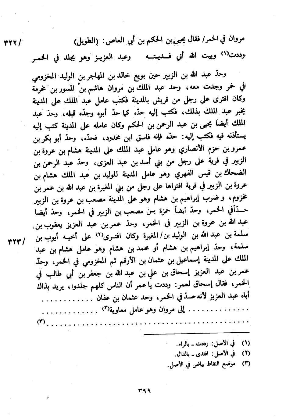 وحدّ عبد الله بن الزبير حين بويع خالد بن المهاجر بن الوليد المخزومي في خمر وجدت معه، وحد عبد الملك بن مروان هاشم بن المسور بن مخرمة وكان افترى على رجل من قريش بالمدينة فكتب عامل عبد الملك على المدينة يخبر عبد الملك بذلك، فكتب إليه حدّه كما حدّ أبوه وجدّه قبله، وحدّ عبد الملك أيضا يحيى بن عبد الرحمن بن الحكم وكان عامله على المدينة كتب إليه يستأذنه فيه فكتب إليه: حدّه فإنه فاسق ابن محدود، فحدّه، وحدّ أبو بكر بن عمرو بن حزم الأنصاري وهو عامل عبد الملك على المدينة هشام بن عروة بن الزبير في فرية على رجل من بني أسد بن عبد العزى، وحدّ عبد الرحمن بن الضحاك بن قيس الفهري وهو عامل المدينة للوليد بن عبد الملك هشام بن عروة بن الزبير في فرية افتراها على رجل من بني المغيرة بن عبد الله بن عمر بن مخزوم، وضرب إبراهيم بن هشام وهو على المدينة مصعب بن عروة بن الزبير حدّا في الخمر، وحدّ أيضا حمزة بن مصعب بن الزبير في الخمر، وحدّ أيضا عبد الله بن عروة بن الزبير في الخمر، وحدّ عمر بن عبد العزيز يعقوب بن سلمة بن عبد الله بن الوليد بن/ المغيرة وكان افترى [2] على أخيه أيوب بن سلمة، وحدّ إبراهيم بن هشام أو محمد بن هشام وهو عامل هشام بن عبد الملك على المدينة إسماعيل بن عثمان بن الأرقم ثم المخزومي في الخمر، وحدّ عمر بن عبد العزيز إسحاق بن علي بن عبد الله بن جعفر بن أبي طالب في الخمر، فقال إسحاق لعمر: وددت يا عمر أن الناس كلهم جلدوا، يريد بذاك أباه عبد العزيز لأنه حدّ في الخمر، وحد عثمان بن عفان ... إلى مروان وهو عامل معاوية ...