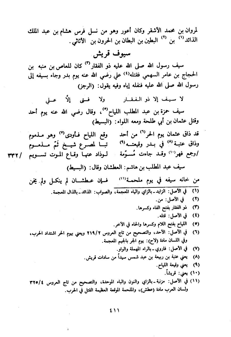 سيف رسول الله صلى الله عليه ذو الفقار [3] كان للعاص بن منبه بن الحجاج بن عامر السهمي فقتله [4] علي رضي الله عنه يوم بدر وجاء بسيفه إلى رسول الله صلى الله عليه فنفله إياه وفيه يقول: (الرجز)