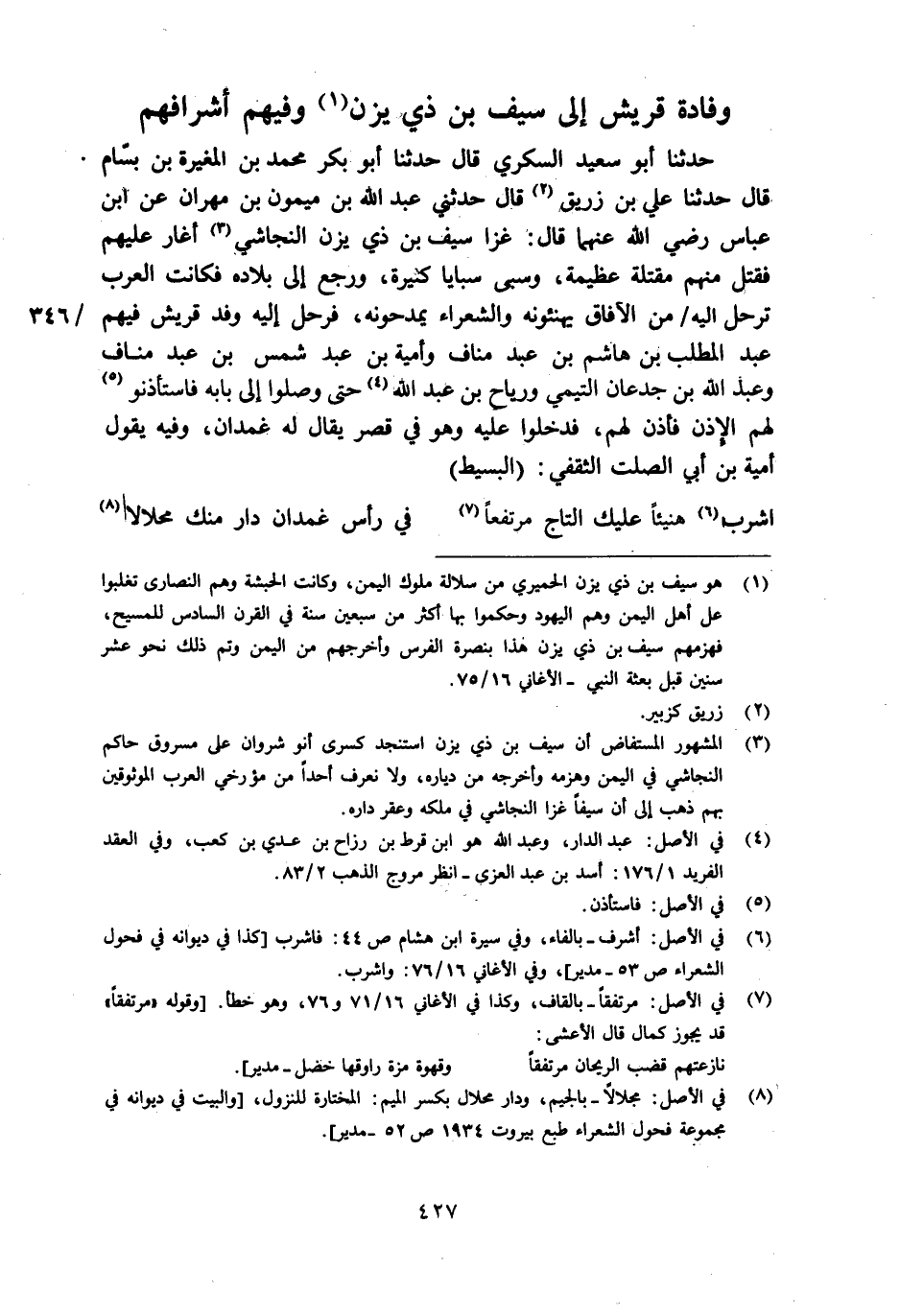 [1] هو سيف بن ذي يزن الحميري من سلالة ملوك اليمن، وكانت الحبشة وهم النصارى تغلبوا عل أهل اليمن وهم اليهود وحكموا بها أكثر من سبعين سنة في القرن السادس للمسيح، فهزمهم سيف بن ذي يزن هذا بنصرة الفرس وأخرجهم من اليمن وتم ذلك نحو عشر سنين قبل بعثة النبي- الأغاني 16/ 75.