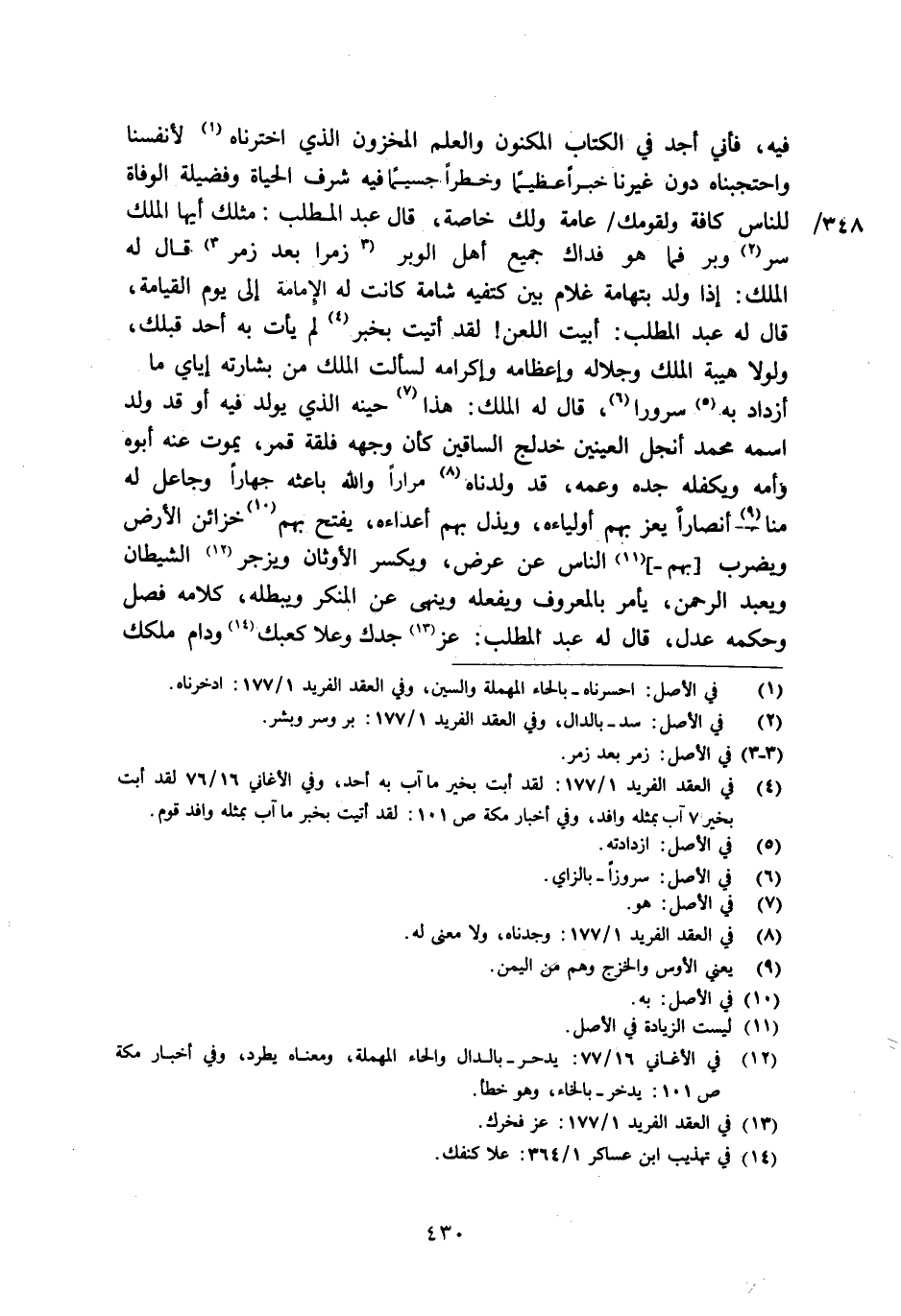 فيه، فأني أجد في الكتاب المكنون والعلم المخزون الذي اخترناه [1] لأنفسنا واحتجبناه دون غيرنا خبرا عظيما وخطرا جسيما فيه شرف الحياة وفضيلة الوفاة للناس كافة ولقومك/ عامة ولك خاصة، قال عبد المطلب: مثلك أيها الملك سر [2] وبر فما هو فداك جميع أهل الوبر [3] زمرا بعد زمر [3] قال له الملك: إذا ولد بتهامة غلام بين كتفيه شامة كانت له الإمامة إلى يوم القيامة، قال له عبد المطلب: أبيت اللعن! لقد أتيت بخبر [4] لم يأت به أحد قبلك، ولولا هيبة الملك وجلاله وإعظامه وإكرامه لسألت الملك من بشارته إياي ما أزداد به [5] سرورا [6] ، قال له الملك: هذا [7] حينه الذي يولد فيه أو قد ولد اسمه محمد أنجل العينين خدلج الساقين كأن وجهه فلقة قمر، يموت عنه أبوه وأمه ويكفله جده وعمه، قد ولدناه [8] مرارا والله باعثه جهارا وجاعل له منا [9] أنصارا يعز بهم أولياءه، ويذل بهم أعداءه، يفتح بهم [10] خزائن الأرض ويضرب [بهم-] [11] الناس عن عرض، ويكسر الأوثان ويزجر [12] الشيطان ويعبد الرحمن، يأمر بالمعروف ويفعله وينهى عن المنكر ويبطله، كلامه فصل وحكمه عدل، قال له عبد المطلب: عز [13] جدك وعلا كعبك [14] ودام ملكك