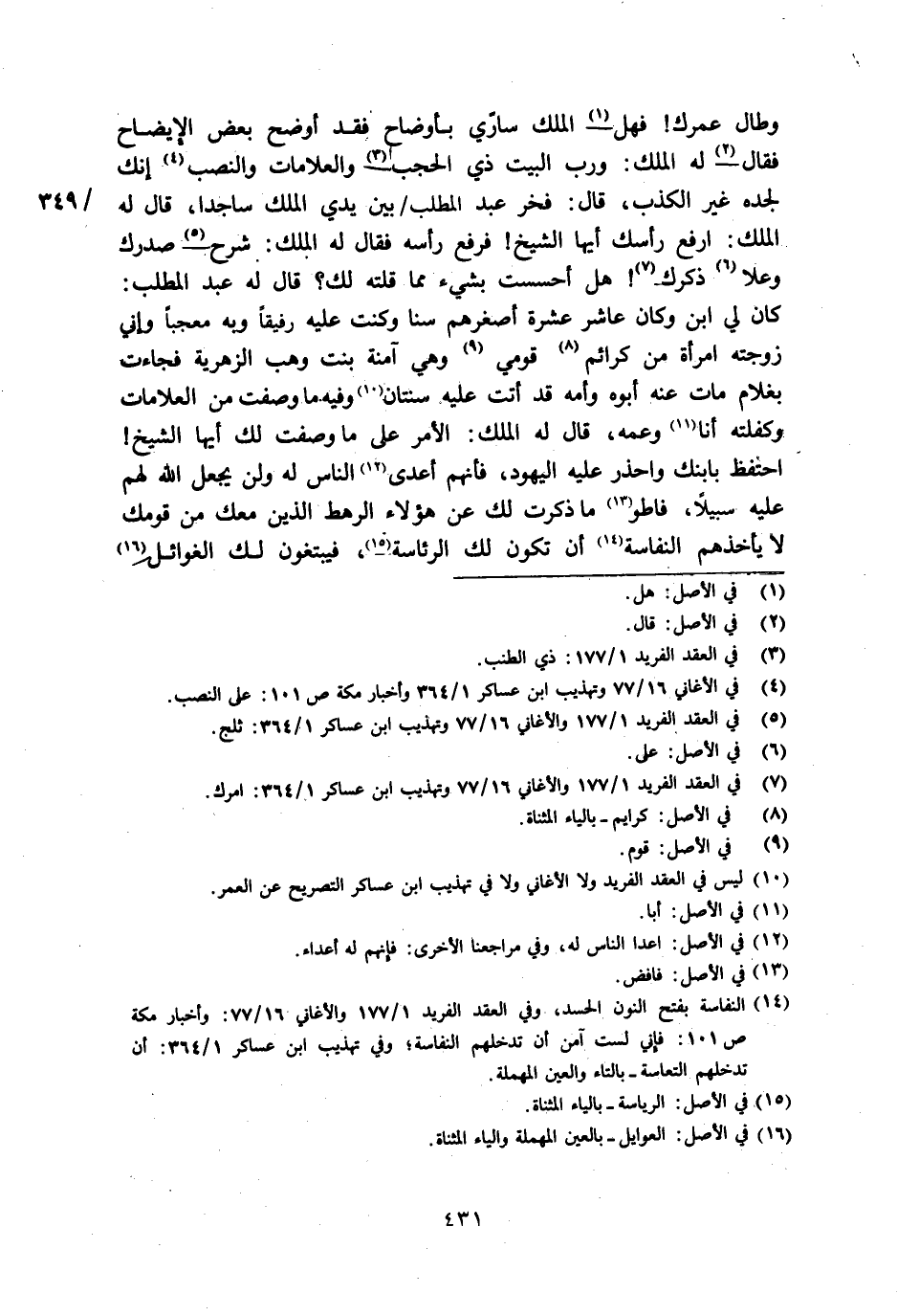 وطال عمرك! فهل [1] الملك سارّي بأوضاح فقد أوضح بعض الإيضاح فقال [2] له الملك: ورب البيت ذي الحجب [3] والعلامات والنصب [4] إنك لجده غير الكذب، قال: فخر عبد المطلب/ بين يدي الملك ساجدا، قال له الملك: ارفع رأسك أيها الشيخ! فرفع رأسه فقال له الملك: شرح [5] صدرك وعلا [6] ذكرك [7] ! هل أحسست بشيء مما قلته لك؟ قال له عبد المطلب: