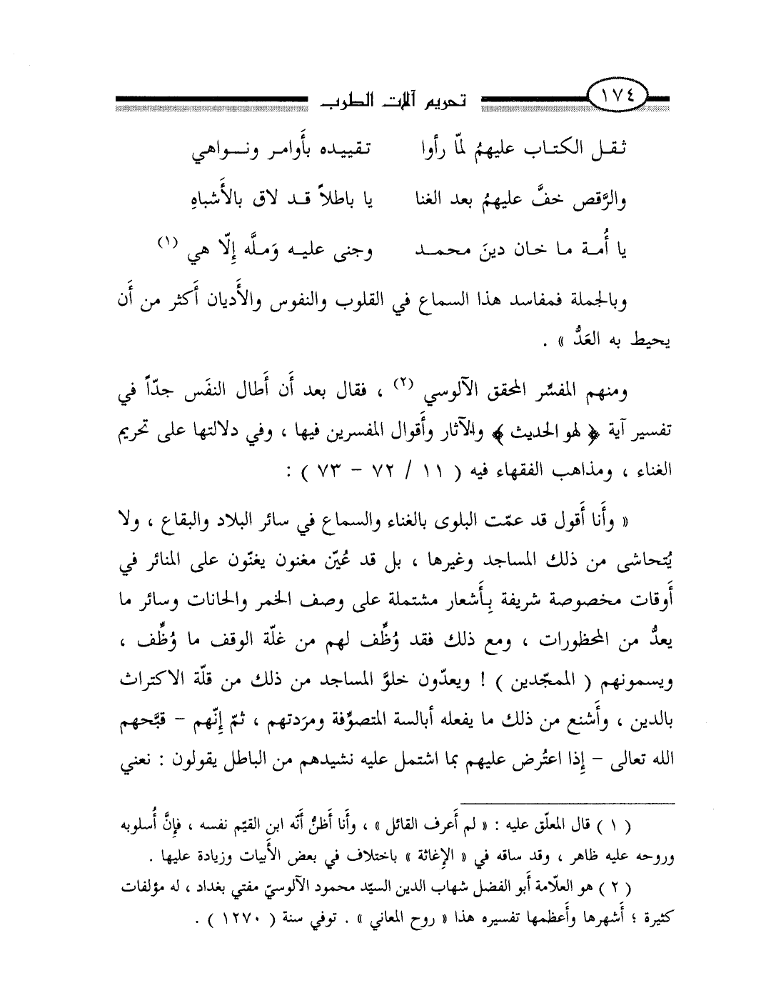 ومنهم المفسر المحقق الآلوسي2 فقال بعد أن أطال النفس جدا في تفسير آية {لَهْوَ الْحَدِيثِ} والآثار وأقوال المفسرين فيها وفي دلالتها على تحريم الغناء ومذهب الفقهاء فيه 11 / 72 - 73: