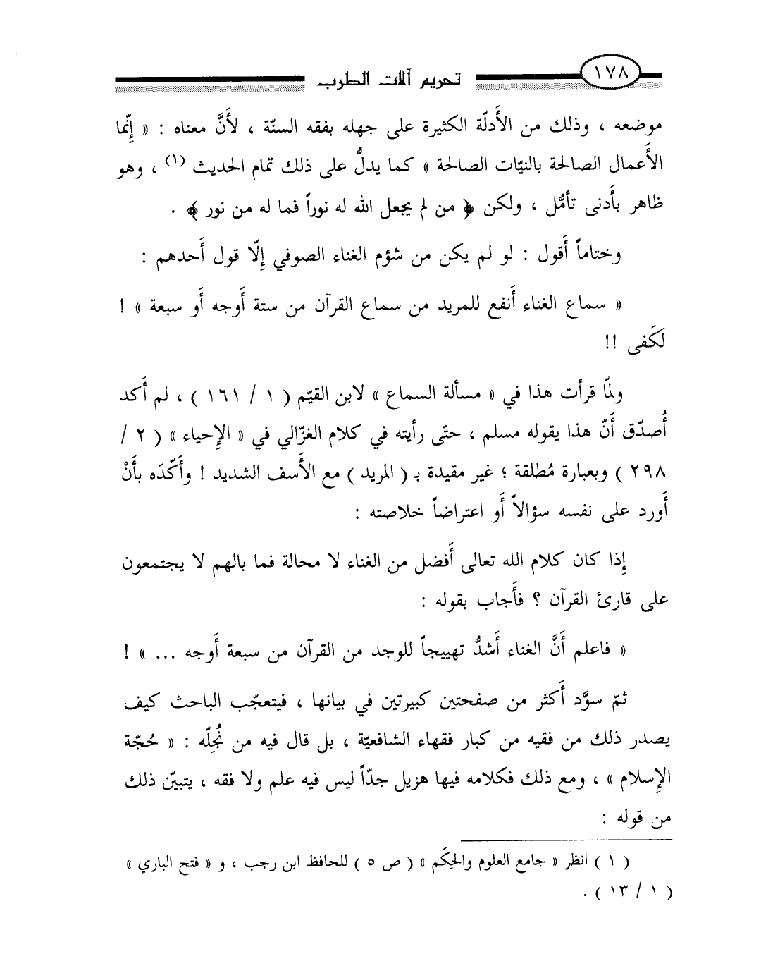 ولما قرأت هذا في مسألة السماع لابن القيم 1 / 161 لم أكد أصدق أن هذا يقوله مسلم حتى رأيته في كلام الغزالي في الإحياء 2 / 298 وبعبارة مطلقة غير مقيدة ب المريد مع الأسف الشديد وأكده بأن أورده على نفسه سؤالا أو اعتراضا خلاصته: