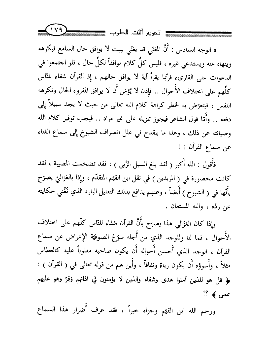 الوجه السادس: أن المغني قد يغني ببيت لا يوافق حال السامع فيكرهه وينهاه عنه ويستدعي غيره فليس كل كلام موافقا لكل حال فلو اجتمعوا في الدعوات على القارئ فربما يقرأ آية لا يوافق حالهم إذ القرآن شفاء للناس كلهم على اختلاف الأحوال ... فإذن لا يؤمن أن لا يوافق المقروء الحال وتكرهه النفس فيتعرض به لخطر كراهة كلام الله تعالى من حيث لا يجد سبيلا إلى دفعه.. وأما قول الشاعر فيجوز تنزيله على غير مراد.. فيجب توقير كلام الله وصيانته عن ذلك وهذا ما ينقدح في علل انصراف الشيوخ إلى سماع الغناء عن سماع القرآن.