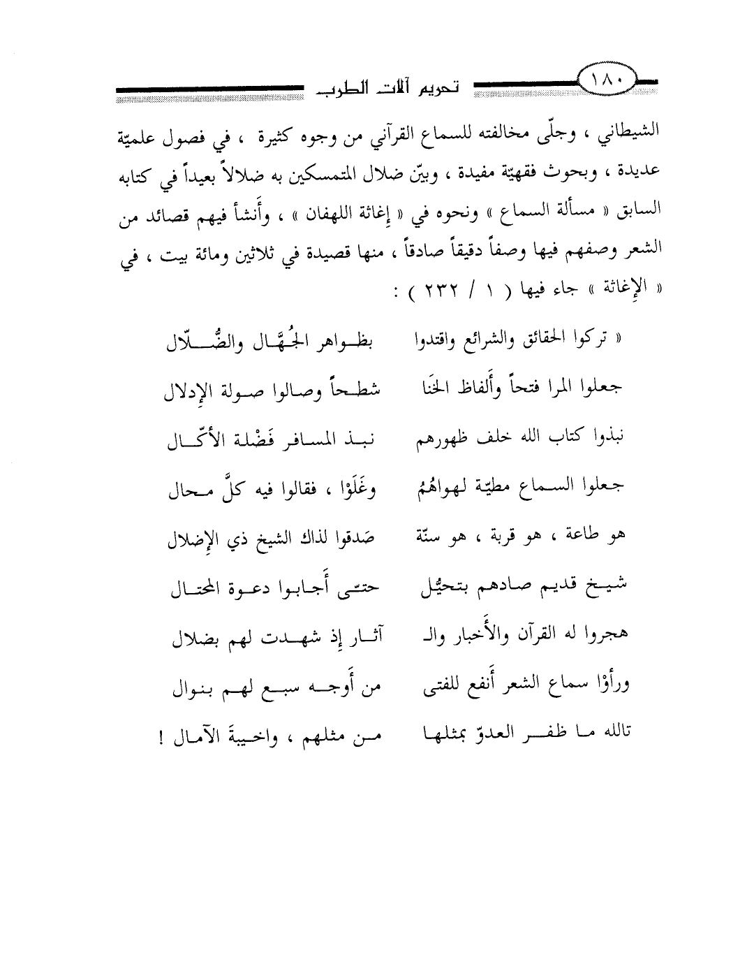الشيطاني وجلى مخالفته للسماع القرآني من وجوه كثيرة في فصول علمية عديدة وبحوث فقهية مفيدة وبين ضلال المتمسكين به ضلالا بعيدا في كتابه السابق مسألة السماع ونحوه في إغاثة اللهفان وأنشأ فيهم قصائد من الشعر وصفهم فيها وصفا دقيقا صادقا منها قصيدة في ثلاثين ومائة بيت في الإغاثة جاء فيها 1 / 232:
