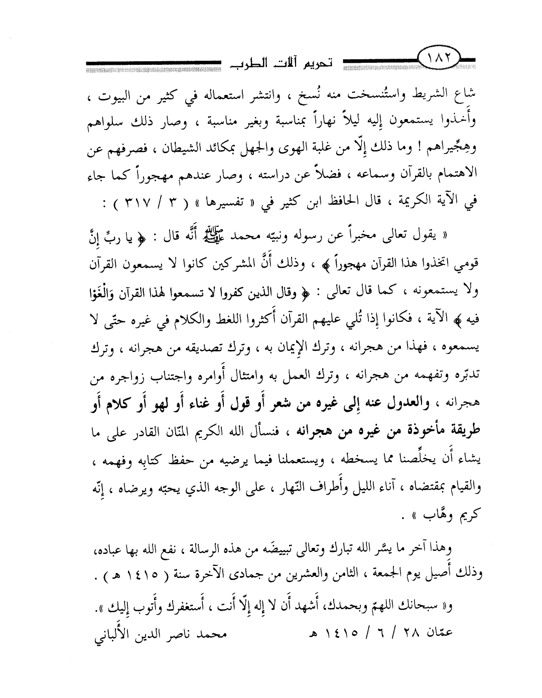 شاع الشريط واستنسخت منه نسخ وانتشر استعماله في كثير من البيوت وأخذوا يستمعون إليه ليلا نهارا بمناسبة وبغير مناسبة وصار ذلك سلواهم وهجيراهم وما ذلك إلا من غلبة الهوى والجهل بمكائد الشيطان فصرفهم عن الاهتمام بالقرآن وسماعه فضلا عن دراسته وصار عندهم مهجورا كما جاء في الآية الكريمة قل الحافظ ابن كثير في تفسيرها3 / 317: